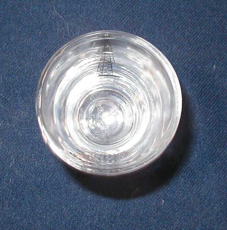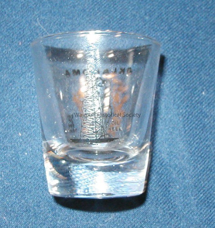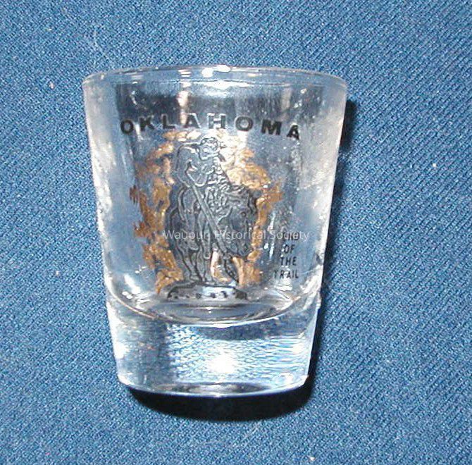 Shot glass with Oklahoma, "End of the Trail." On the back is an oil well. On the bottom is the letter "L" and the number 10. Purchased by Jim Laird on eBay.Acquisition