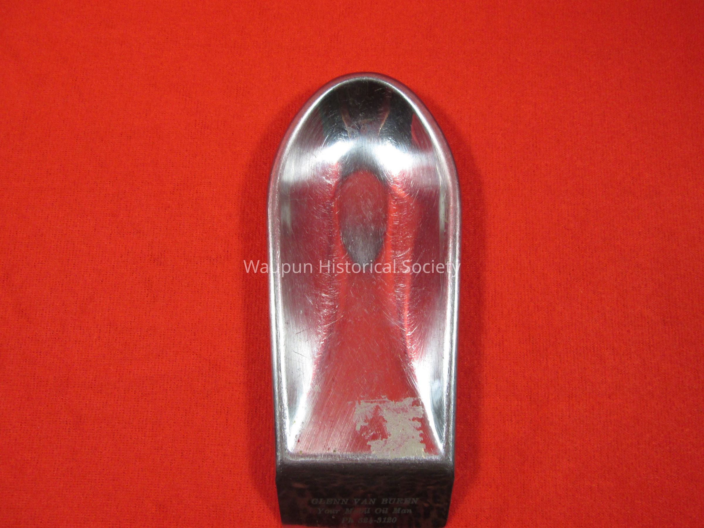 Stainless steel spoon holder advertising Glenn VanBuren, Your Mobil Oil Man, Ph. 324-3120.Acquisition