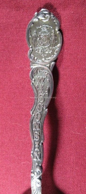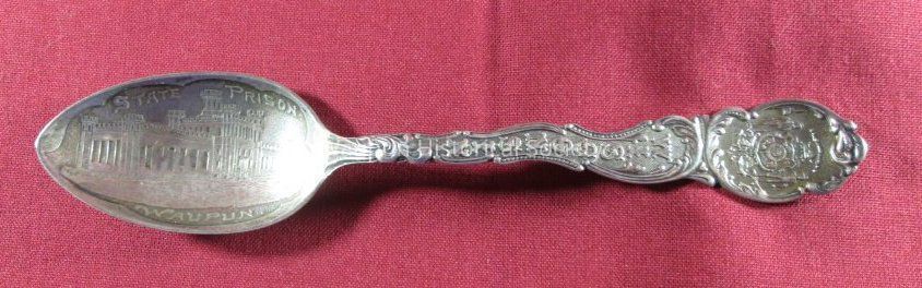 Spoon from collection. Sterling silver/gold wash with very embelished handle. Carved in the bowl of the spoon is a picture of the State Prison with the words "State Prison" and "Waupun". The image of the prison is different from the previous spoon.The handle shows the state seal at the top and "Wisconsin" carved in the length of the handle. The back of the spoon handle has the word "sterling" and is less decorative.Acquisition
