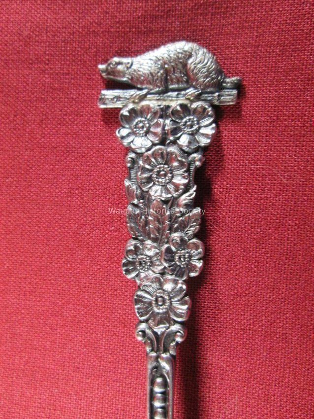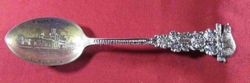 Spoon from collection. Sterling silver/gold wash with decorative handle. Engraved in the bowl of the spoon is a picture of the State Prison with the words "State Prison" and "Waupun Wis." The image of the prison is different from the previous spoon.The handle has a floral pattern with an image of a badger.The back side of the spoon has the word "sterling".Acquisition