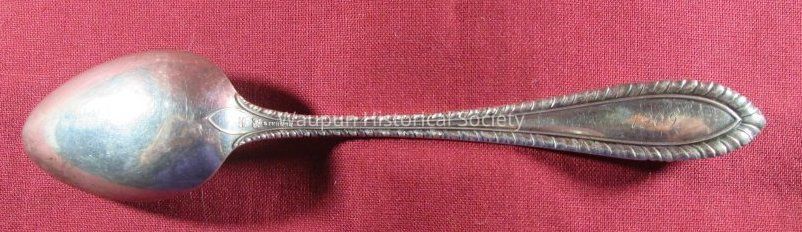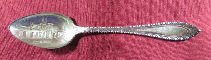 Spoon from collection. Sterling silver/gold wash with decorative handle. Engraved in the bowl of the spoon is a picture of the State Prison with the words "State Prison" and "Waupun Wis". The image of the prison is different from the previous spoon. The back side of the spoon has the date of 1909 engraved on the handle.Acquisition