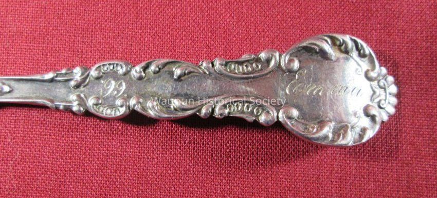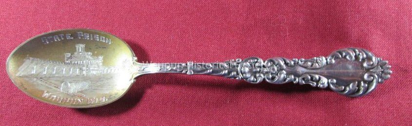 Spoon from collection. Sterling silver/gold wash with decorative handle. Engraved in the bowl of the spoon is a picture of the State Prison with the words "State Prison" and "Waupun Wis." The back side of the spoon has the number "99" (1899 ) and the name "Emma" engraved on it.Acquisition