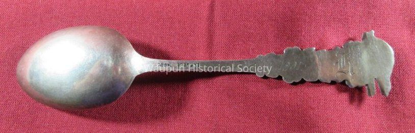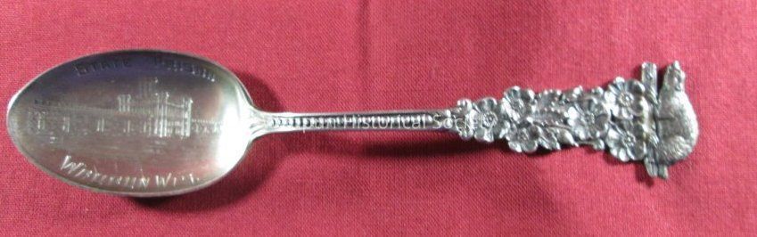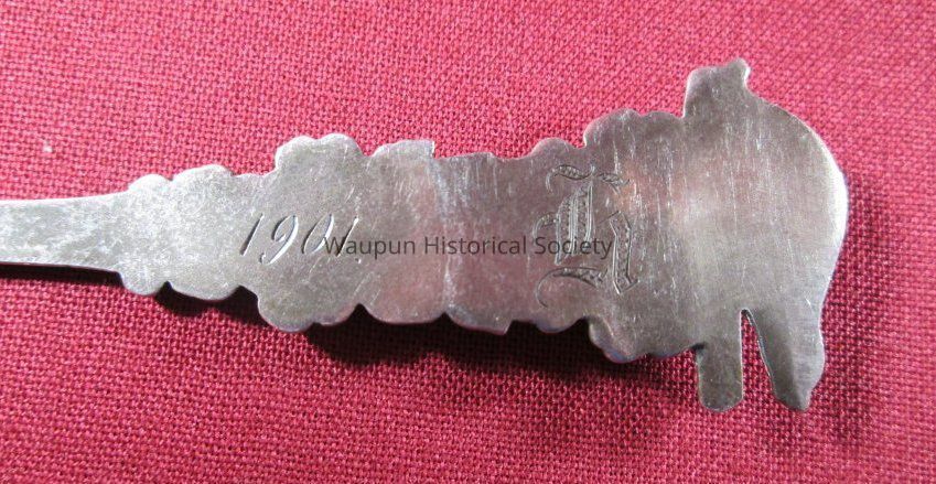 Spoon from collection. Sterling silver/gold wash with decorative handle. Engraved in the bowl of the spoon is a picture of the State Prison with the words "State Prison" and "Waupun Wis." The image of the prison is different from the previous spoon.The handle has a floral pattern with an image of a badger.The back side of the spoon has the word "sterling", the year 1901 and the letter "G" engraved on the handle.Acquisition