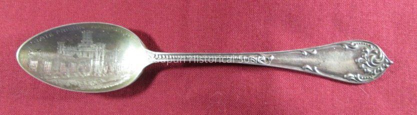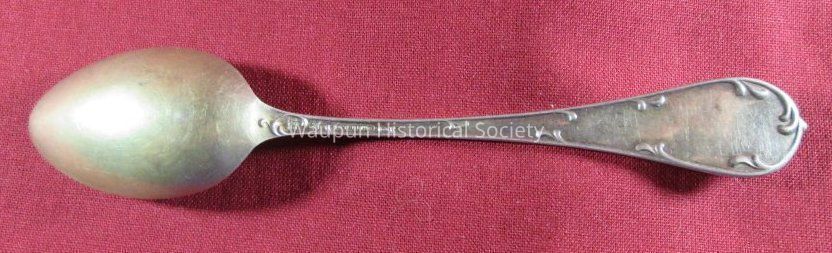 Spoon from collection. Sterling silver/gold wash with decorative handle. Engraved in the bowl of the spoon is a picture of the State Prison with the words "State Prison" and "Waupun Wis". The image of the prison is different from the previous spoon. The back side of the spoon has some decoration, maker's symbols and the word sterling on the handle.Acquisition
