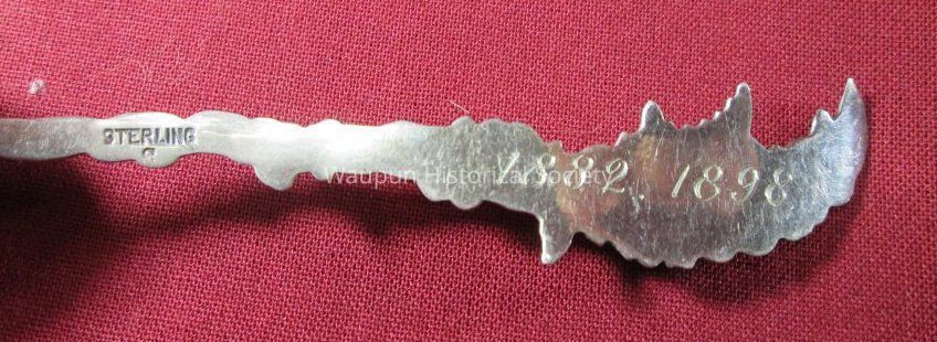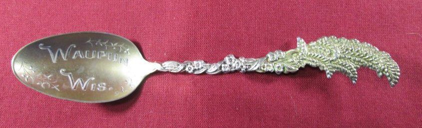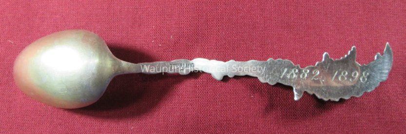 Spoon from collection. Sterling silver/gold wash with decorative floral handle. Engraved in the bowl of the spoon is "Waupun Wis". On the back of the handle is the word "sterling" and the years 1882 and 1898.Acquisition