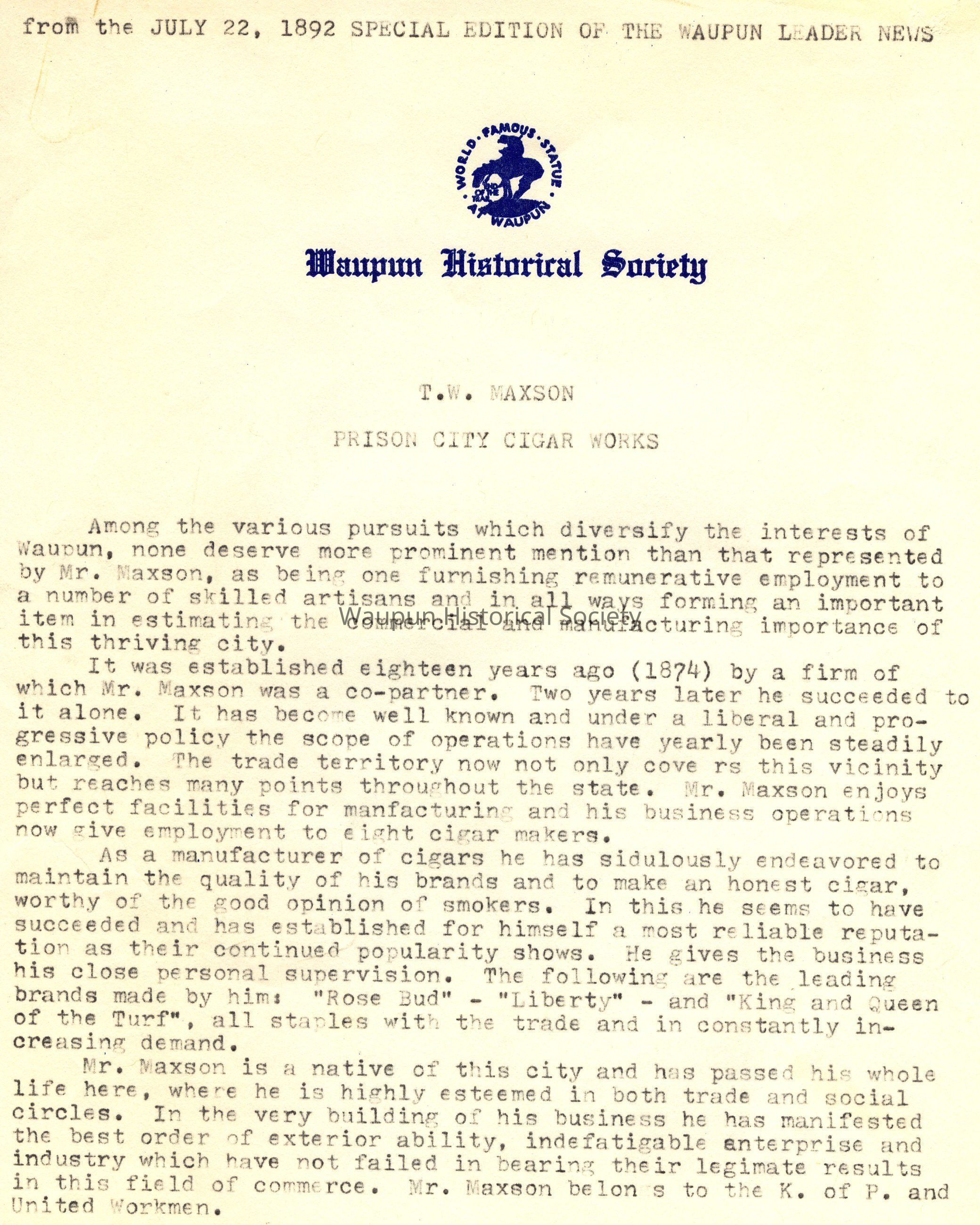 Histories, T. W. Maxson, Prison City Cigar WorksEntry/Object ID