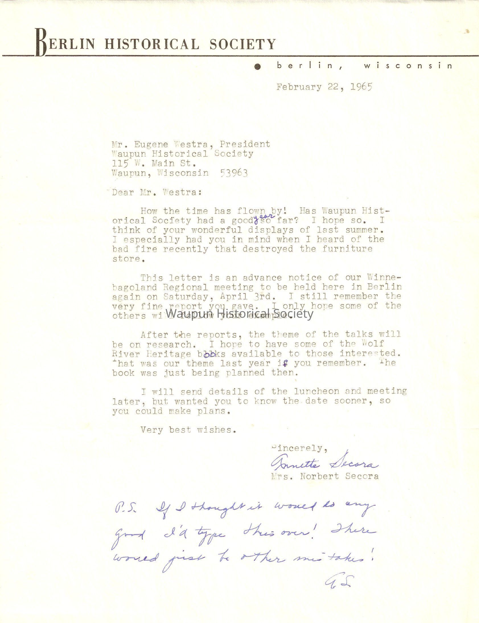 This letter is an advance notice of our Winnebagoland Regional meeting to be held here in Berlin again on Saturday, April 3rd. I still remember the very fine report you gave. I only hope some of the others will follow your example.