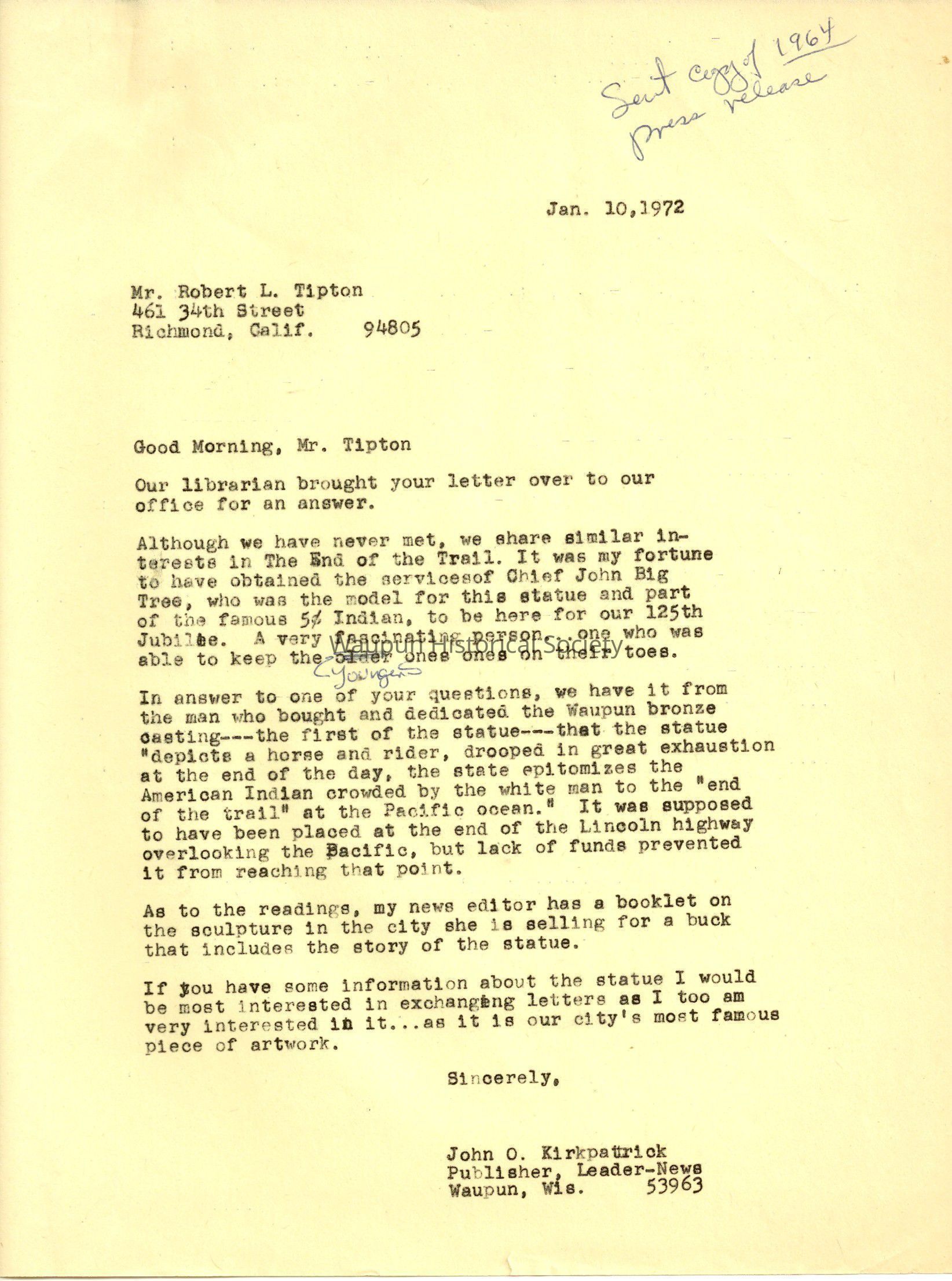 Letter, John Kirkpatrick to Robert Tipton, End of the TrailEntry/Object ID