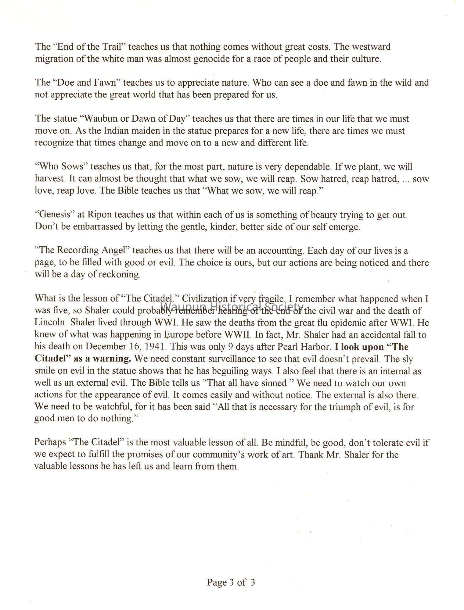 I have never seen a factual account of the order of the statues that Mr. Shaler created. Remember that "Who Sows" and "The Citadel" were not direct gifts to Waupun by Mr. Shaler. They were both given to other institutions, then after years came to us. If you study the movements of the statues it seems that there was almost a Devine providence in their arrival here. We certainly must recognize Mr. Hanisch for making the arrangements and for paying for the shipping of the statue "The Citadel" to Waupun. (Applause)