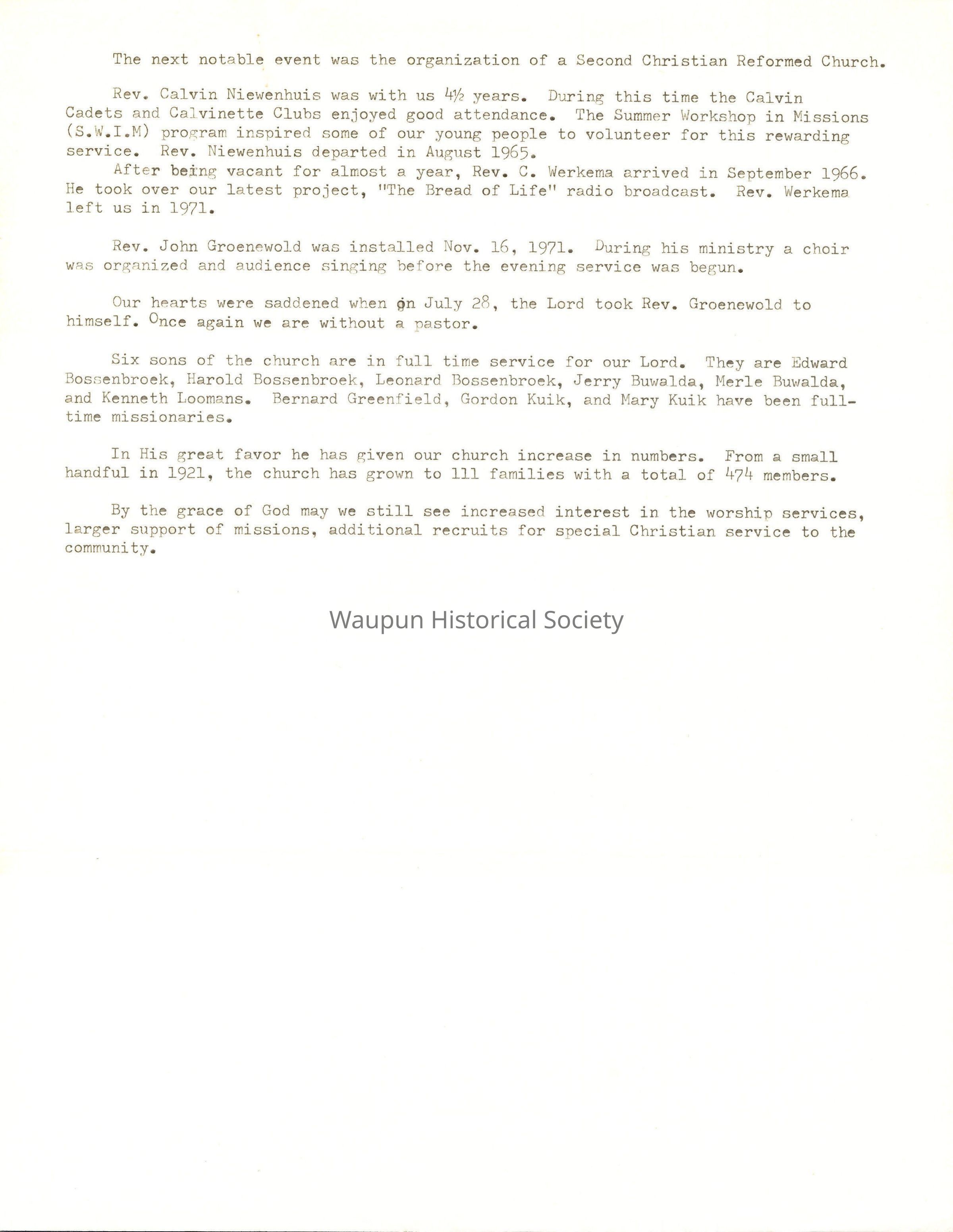 Six sons of the church are in full time service for our Lord. They are Edward Bossenbroek, Harold Bossenbroek, Leonard Bossenbroek, Jerry Buwalda, Merle Buwalda, and Kenneth Loomans. Bernard Greenfield, Gordon Kuik, and Mary Kuik have been full- time missionaries.