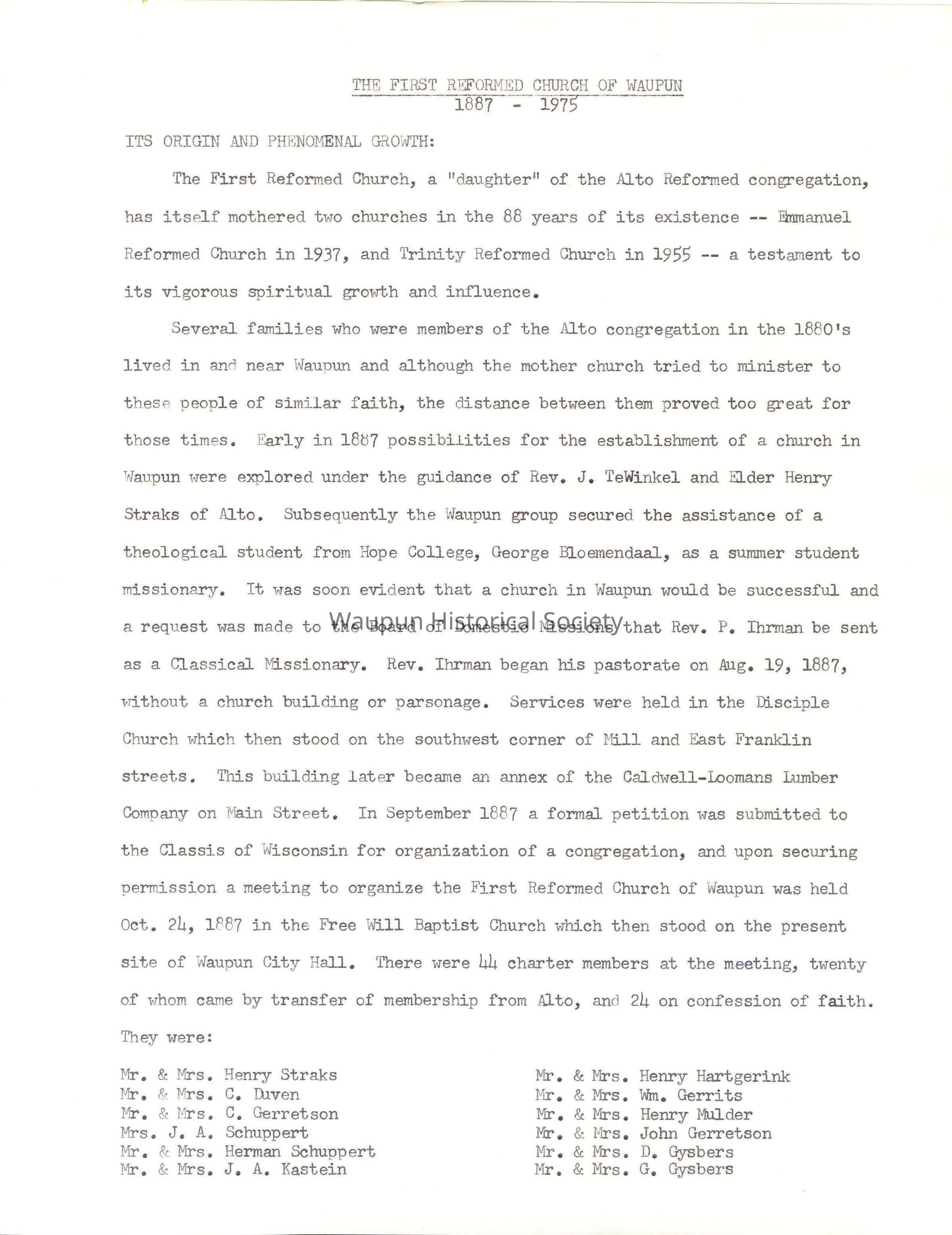 Several families who were members of the Alto congregation in the 1880's lived in and near Waupun and although the mother church tried to minister to these people of similar faith, the distance between them proved too great for those times. Early in 187S7 possibilities for the establishment of a church in Waupun were explored under the guidance of Rev. J. TeWinkel and Elder Henry Straks of Alto. Subsequently the Waupun group secured the assistance of a theological student from Hope College, George Bloemendaal, as a summer student missionary. It was soon evident that a church in Waupun would be successful and a request was made to the Board of Domestic Missions that Rev. P. Ihrman be sent as a Classical Missionary. Rev. Ihrman began his pastorate on Aug. 19, 1887, without a church building or parsonage. Services were held in the Disciple Church which then stood on the southwest corner of Mill and East Franklin streets. This building later became an annex of the Caldwell-Loomans Lumber Company on Main Street. In September 1887 a formal petition was submitted to the Classis of Wisconsin for organization of a congregation, and upon securing permission a meeting to organize the First Reformed Church of Waupun was held Oct. 24, 1887 in the Free Will Baptist Church which then stood on the present site of Waupun City Hall. There were 44 charter members at the meeting, twenty of whom came by transfer of membership from Alto, and 24 on confession of faith.