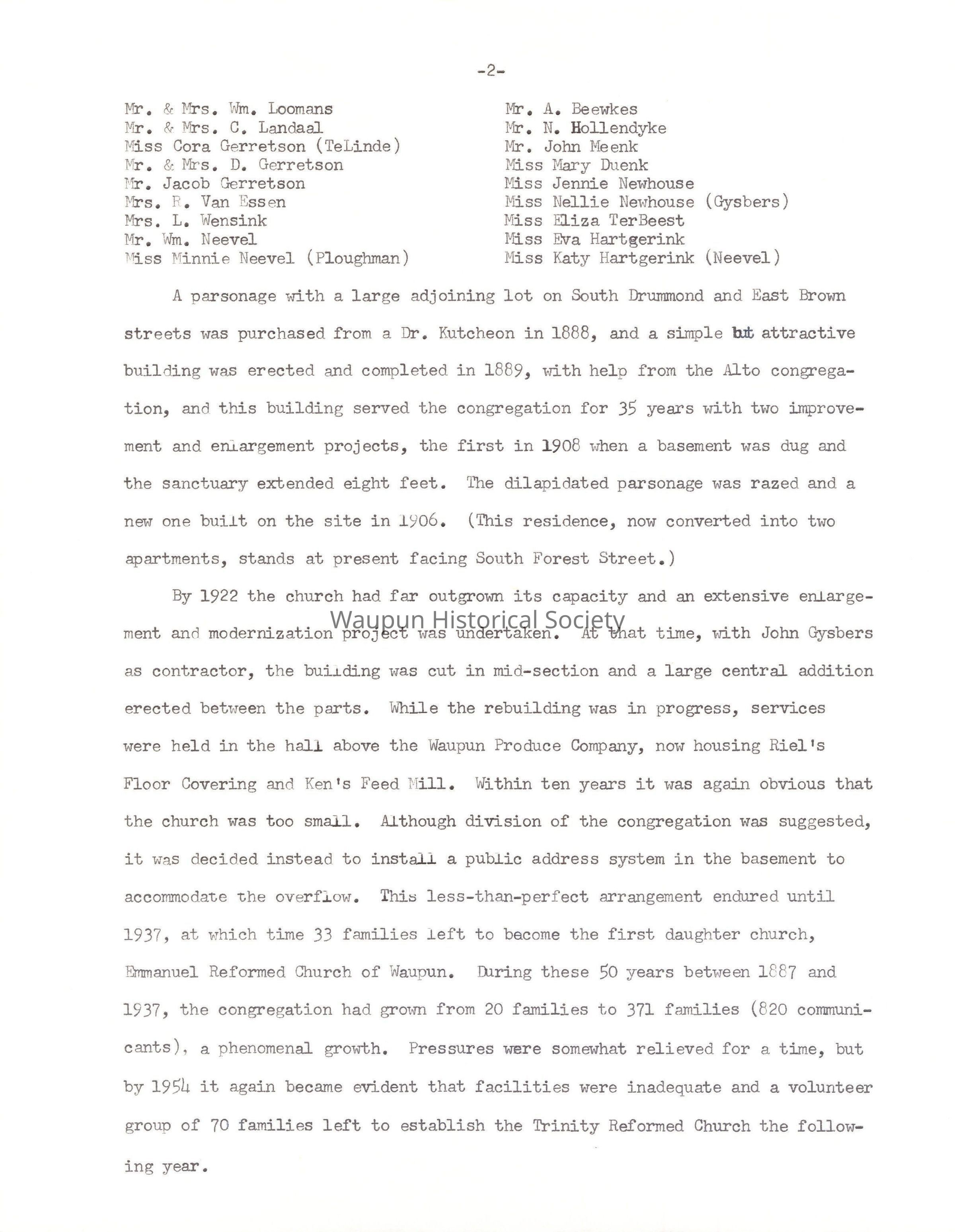 By 1922 the church had far outgrown its capacity and an extensive enlargement and modernization project was undertaken. At that time, with John Gysbers as contractor, the building was cut in mid-section and a large central addition erected between the parts. While the rebuilding was in progress, services were held in the hall above the Waupun Produce Company, now housing Riel's Floor Covering and Ken's Feed Mill. Within ten years it was again obvious that the church was too small. Although division of the congregation was suggested, it was decided instead to install a public address system in the basement to accommodate the overflow. This less-than-perfect arrangement endured until 1937, at which time 33 families left to become the first daughter church, Emmanuel Reformed Church of Waupun. During these 50 years between 1887 and 1937, the congregation had grown from 20 families to 371 families (820 communicants), a phenomenal growth. Pressures were somewhat relieved for a time, but by 1954 it again became evident that facilities were inadequate and a volunteer group of 70 families left to establish the Trinity Reformed Church the following year.