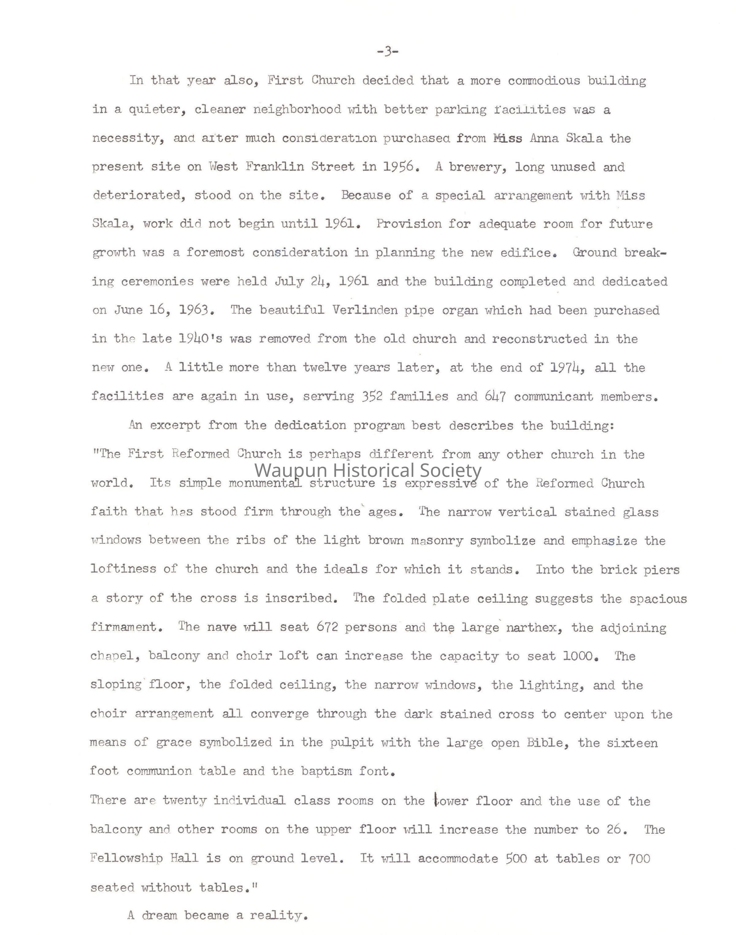 In that year also, First Church decided that a more commodious building in a quieter, cleaner neighborhood with better parking facilities was a necessity, and alter much consideration purchased from Miss Anna Skala the present site on West Franklin Street in 1956. A brewery, long unused and deteriorated, stood on the site. Because of a special arrangement with Miss Skala, work did not begin until 1961. Provision for adequate room for future growth was a foremost consideration in planning the new edifice. Ground breaking ceremonies were held July 24, 1961 and the building completed and dedicated on June 16, 1963. The beautiful Verlinden pipe organ which had been purchased in the late 1940's was removed from the old church and reconstructed in the new one. A little more than twelve years later, at the end of 1974, all the facilities are again in use, serving 352 families and 647 communicant members.