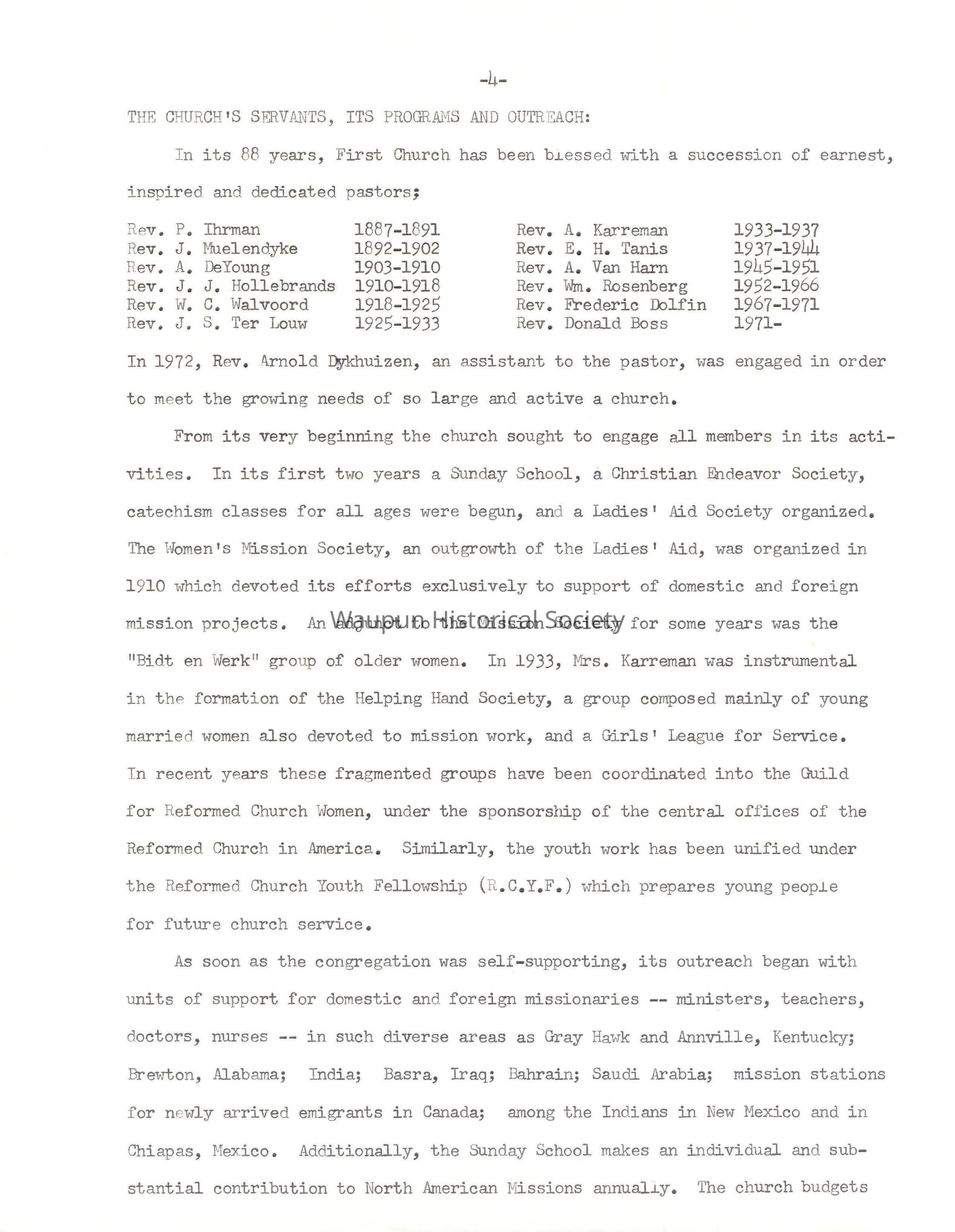 From its very beginning the church sought to engage all members in its activities. In its first two years a Sunday School, a Christian Endeavor Society, catechism classes for all ages were begun, and a Ladies' Aid Society organized. The Women's Mission Society, an outgrowth of the Ladies' Aid, was organized in 1910 which devoted its efforts exclusively to support of domestic and foreign mission projects. An adjunct to the Mission Society for some years was the "Bidt en Werk" group of older women. In 1933, Mrs. Karreman was instrumental in the formation of the Helping Hand Society, a group composed mainly of young married women also devoted to mission work, and a Girls' League for Service. In recent years these fragmented groups have been coordinated into the Guild for Reformed Church Women, under the sponsorship of the central offices of the Reformed Church in America. Similarly, the youth work has been unified under the Reformed Church Youth Fellowship (R.C.Y.F.) which prepares young people for future church service.