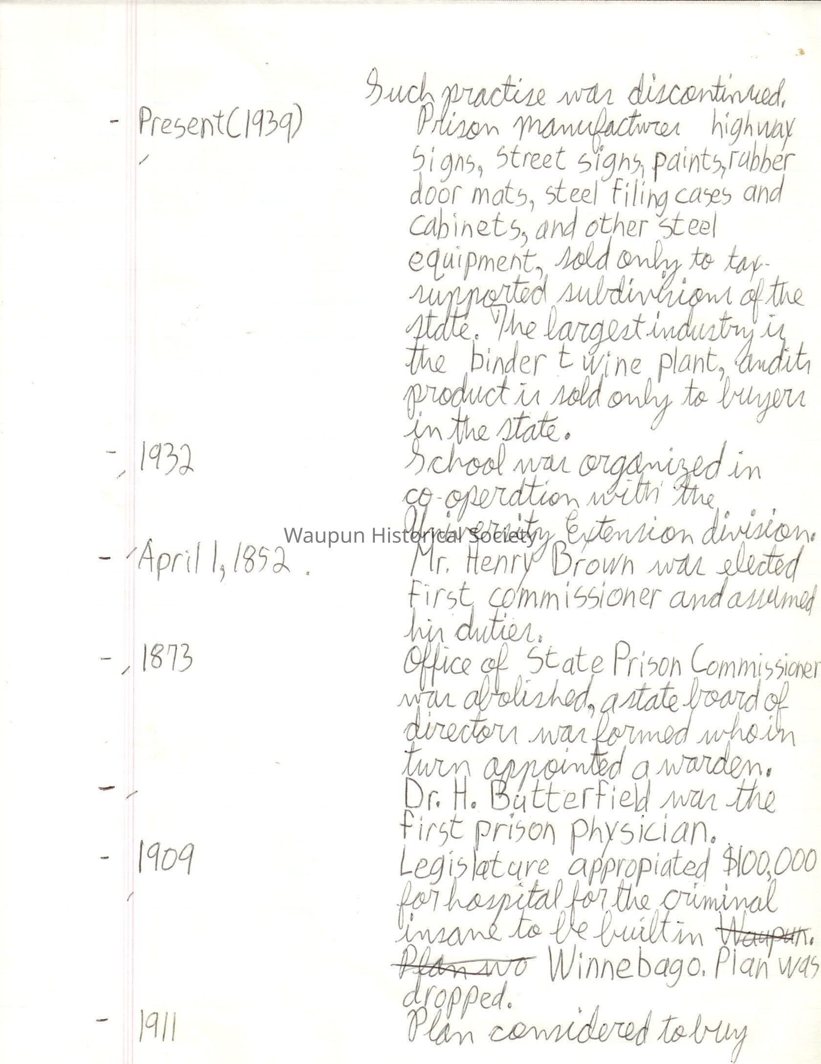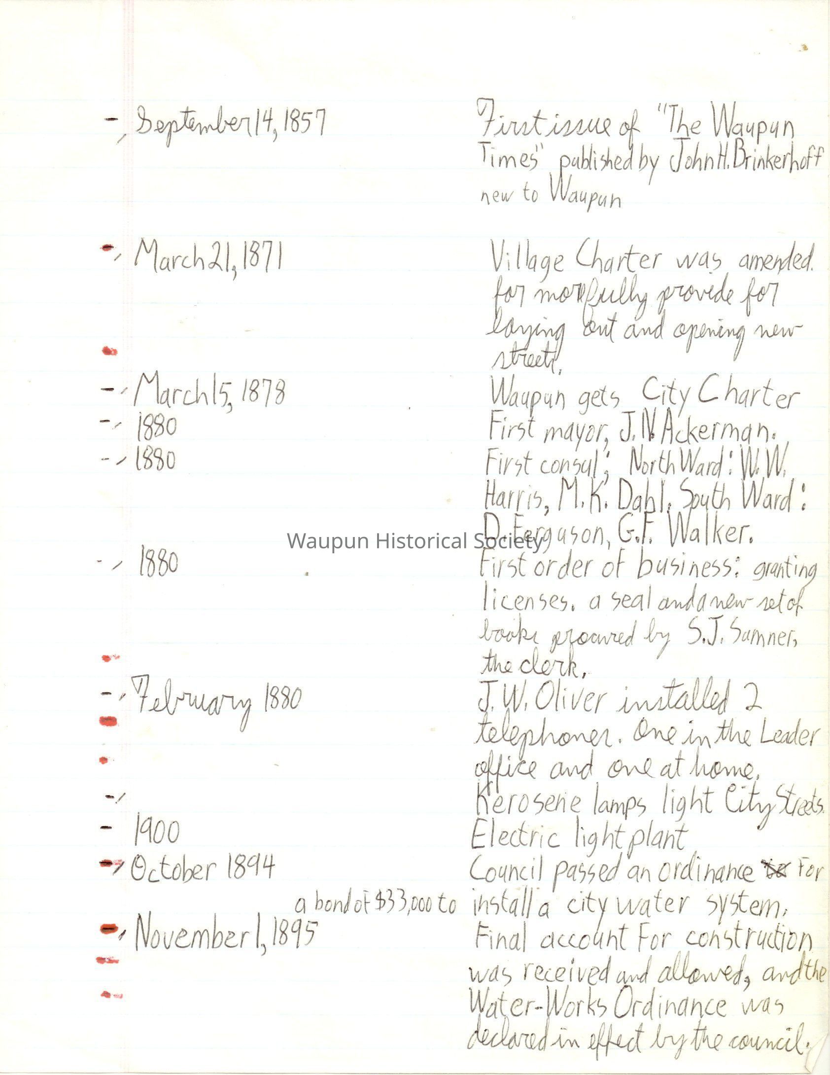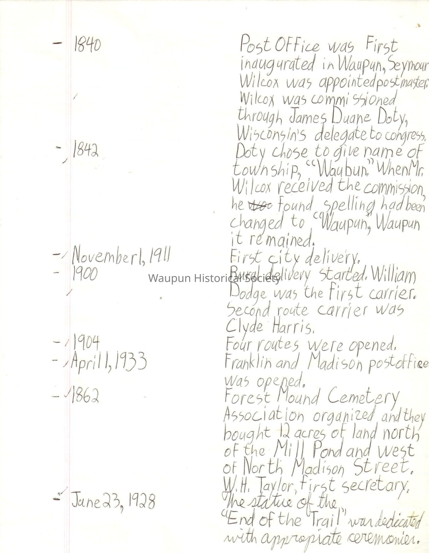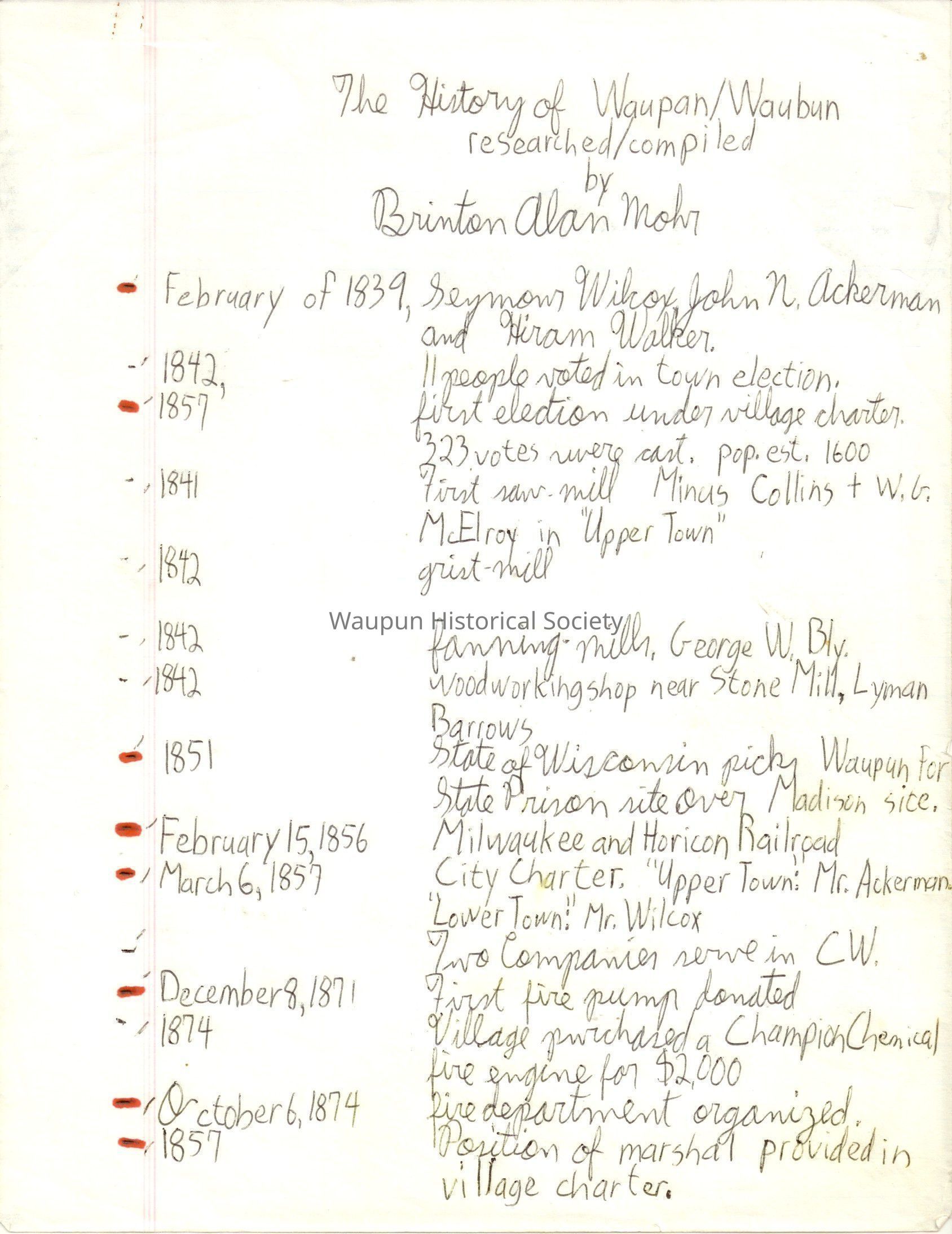 This is ten pages of hand written research compiled by Briton Alan Mohr. It is written in the form of a time line for the city of Waupan/Waubun beginning in 1839 and ending with 1982.Acquisition
