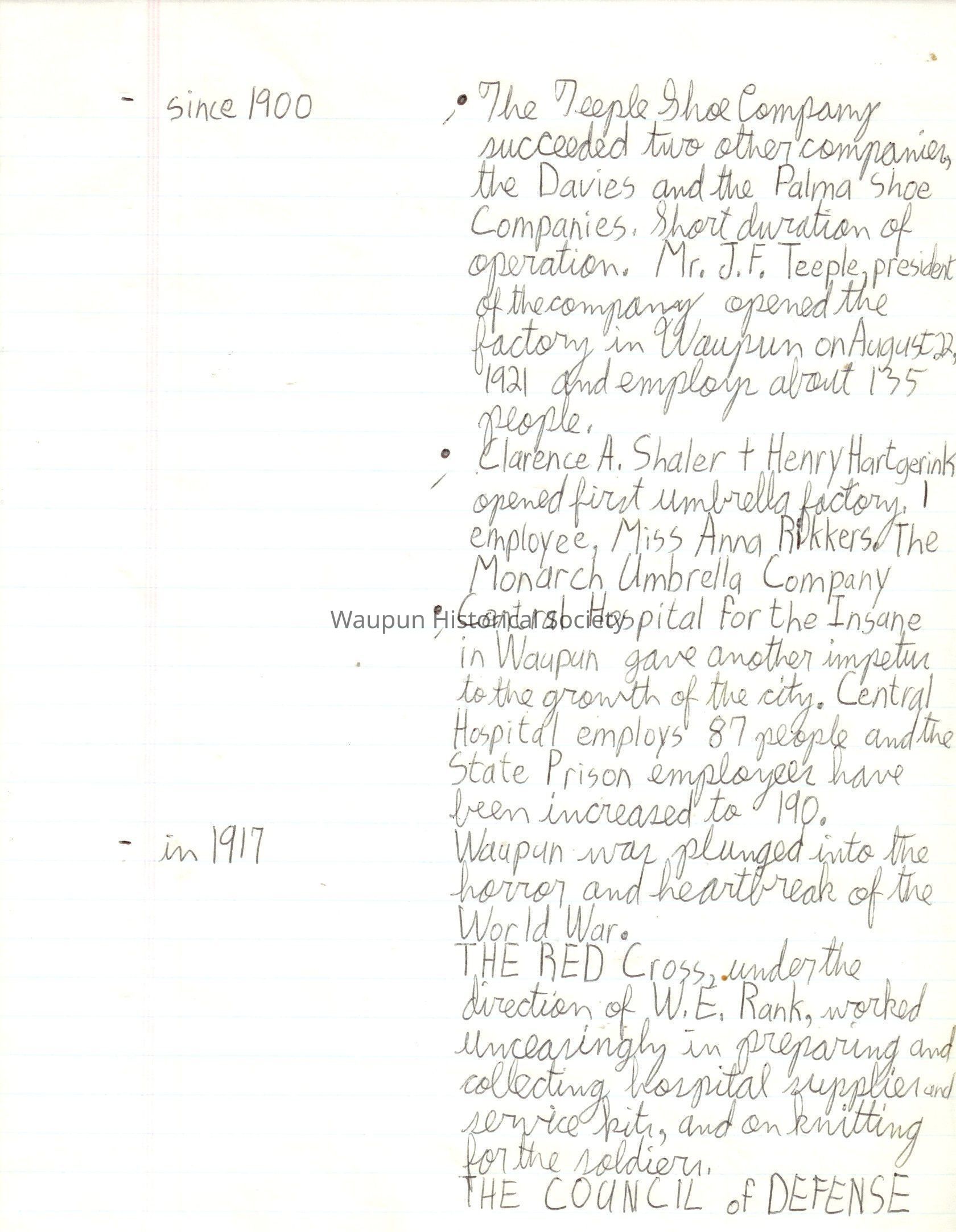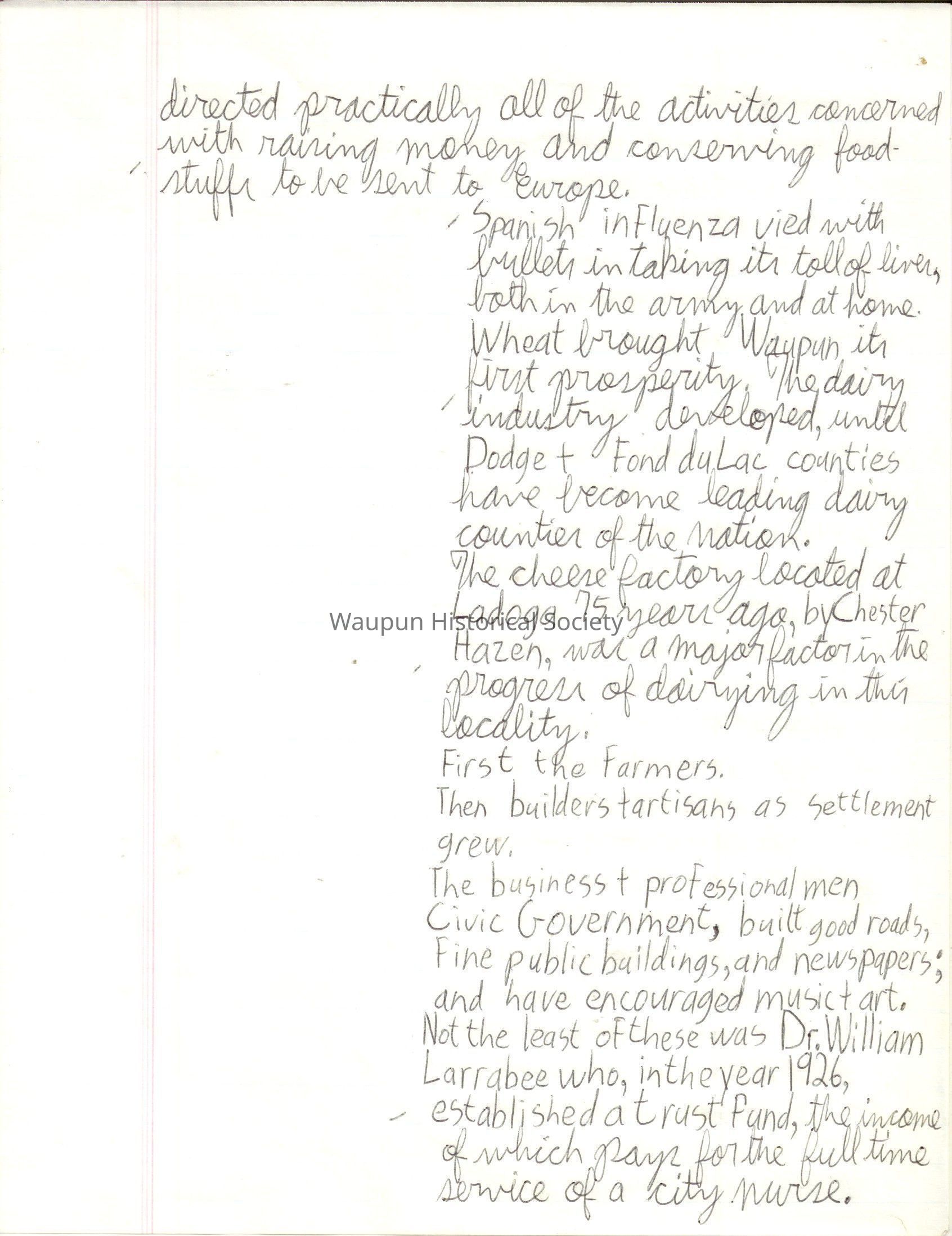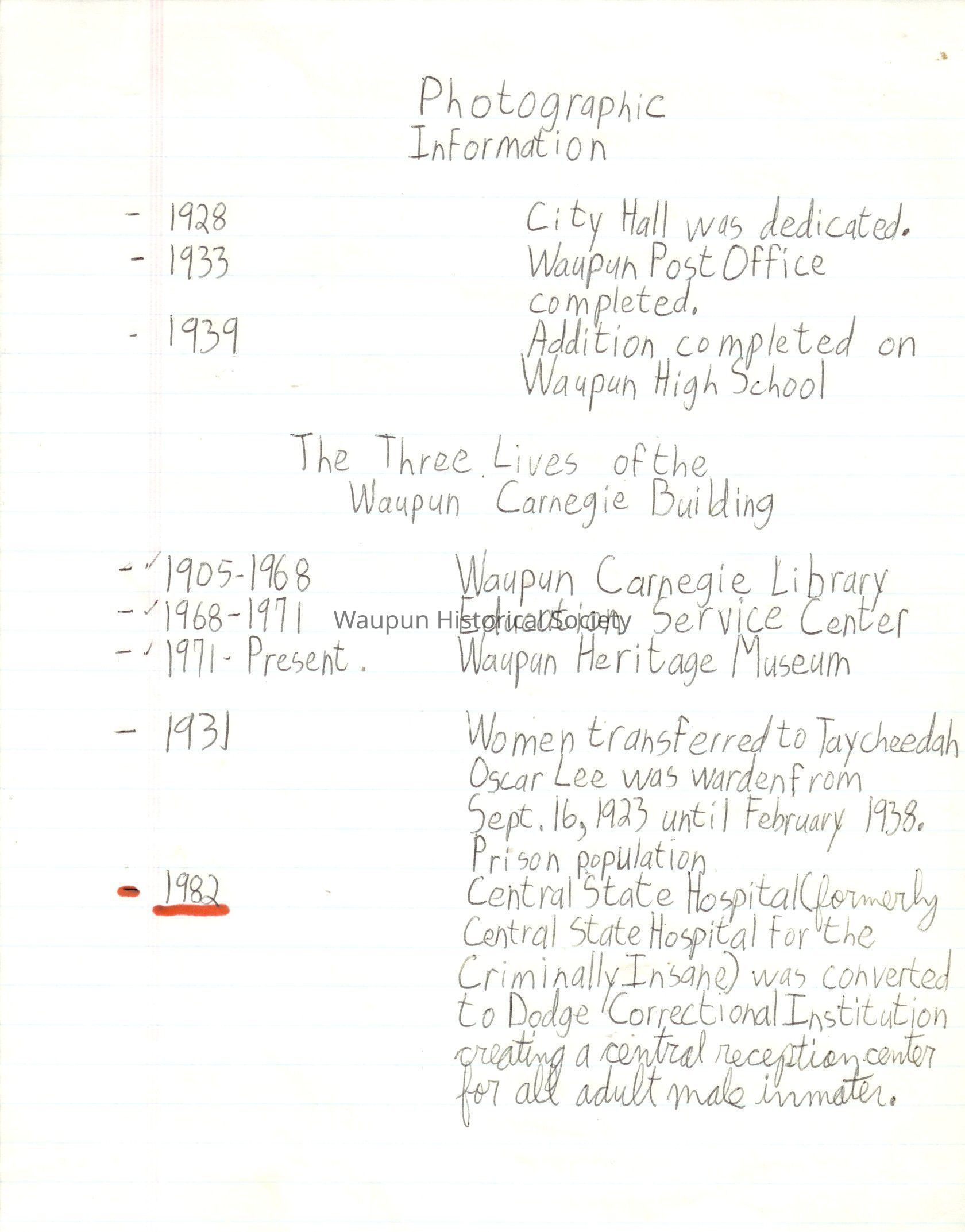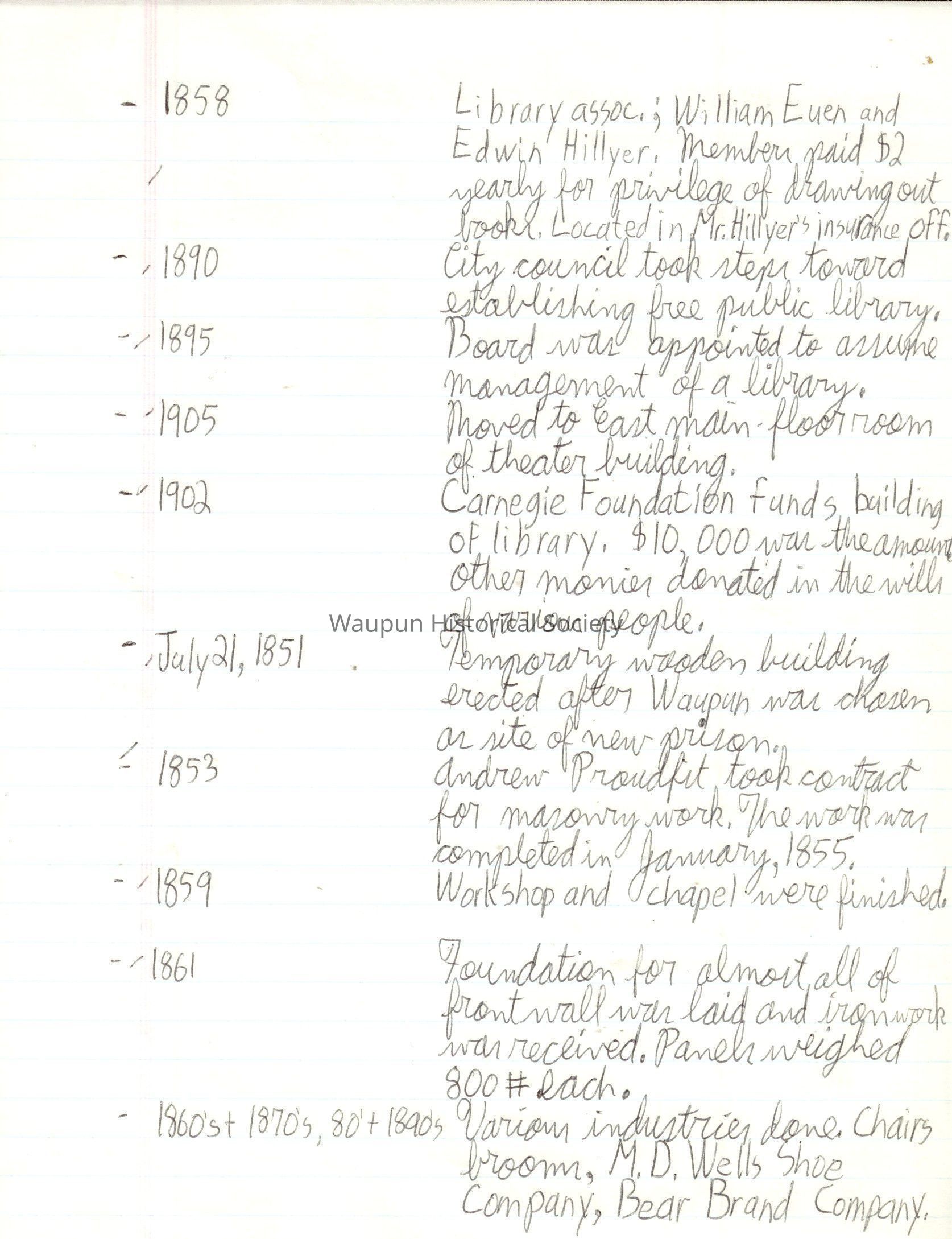 This is ten pages of hand written research compiled by Briton Alan Mohr. It is written in the form of a time line for the city of Waupan/Waubun beginning in 1839 and ending with 1982.Acquisition