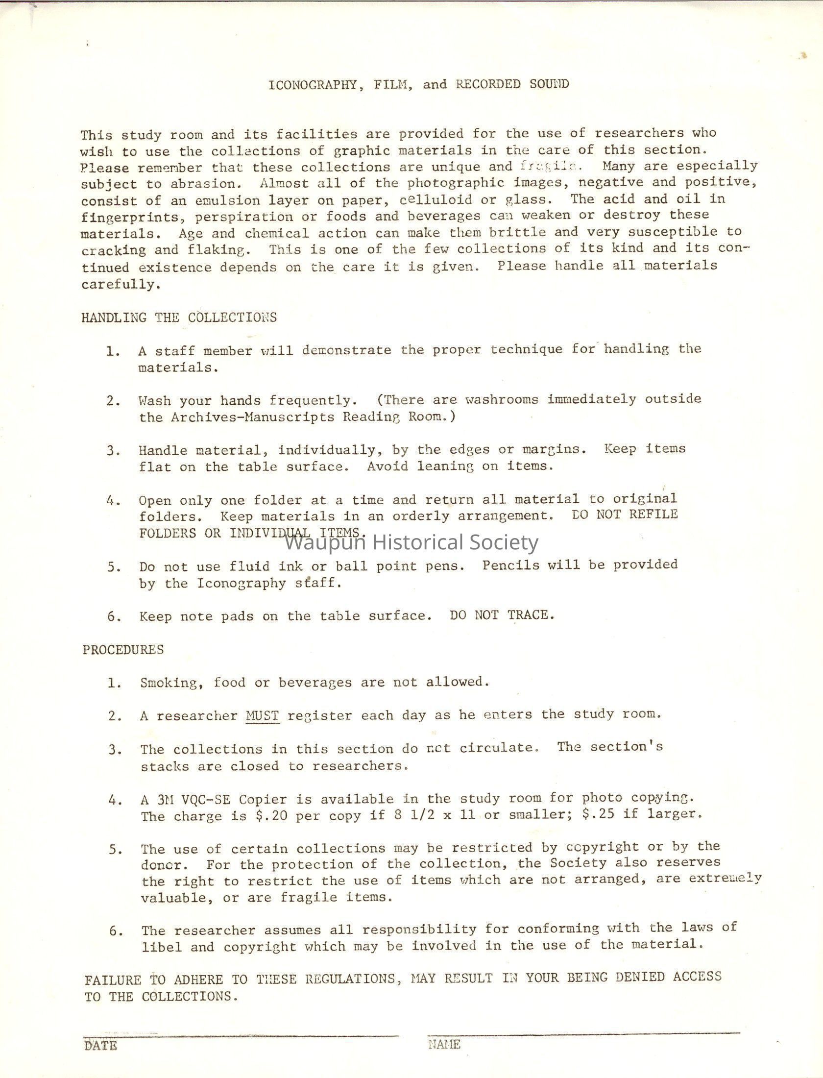 FAILURE TO ADHERE TO TUESE REGULATIONS, MAY RESULT IN YOUR BEING DENIED ACCESS TO THE COLLECTIONS.Acquisition