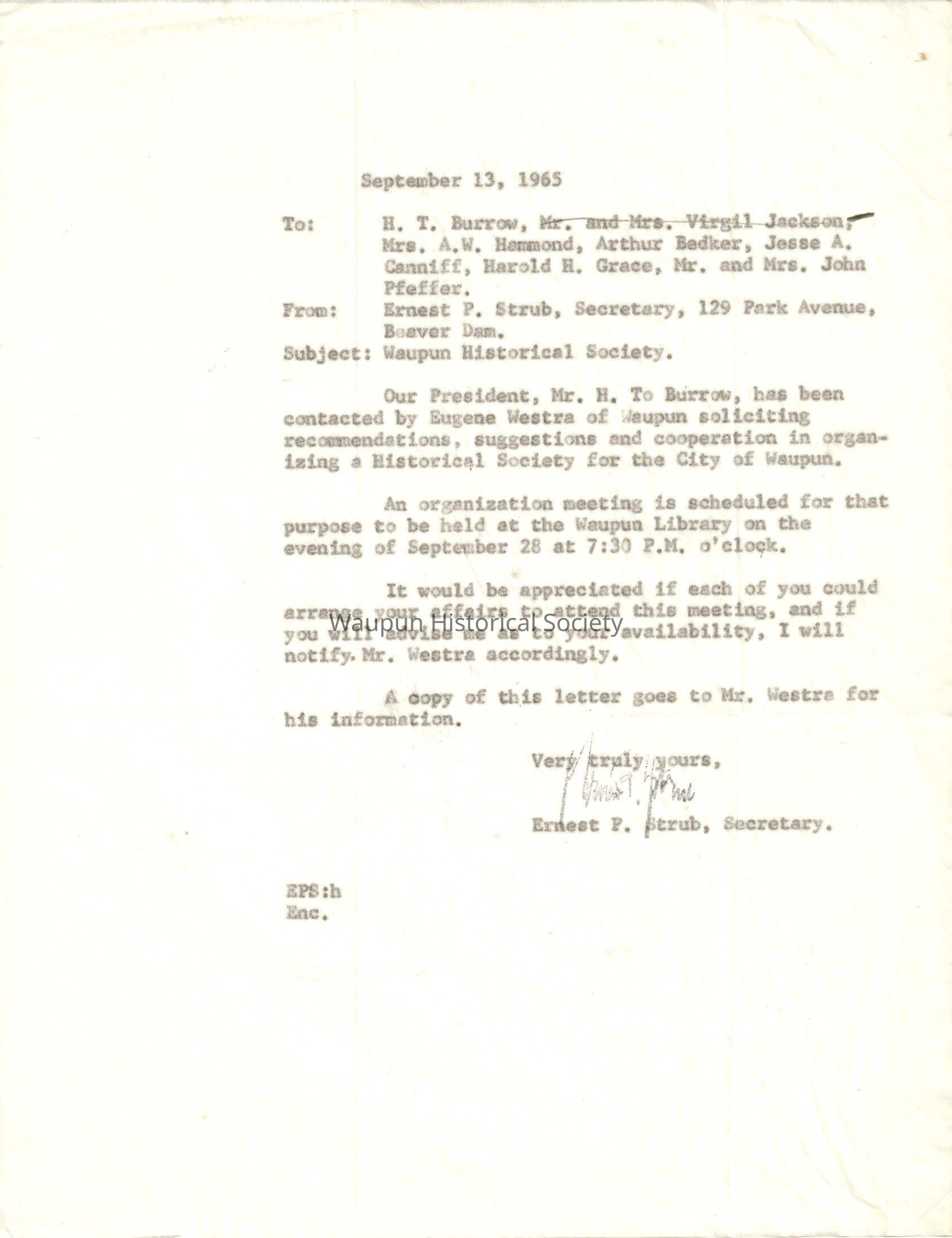 Our President, Mr. H. T. Burrow, has been contacted by Eugene Westra of Waupun soliciting recommendations, suggestions and cooperotion in organizing a Historica1 Society for the City of waupun.