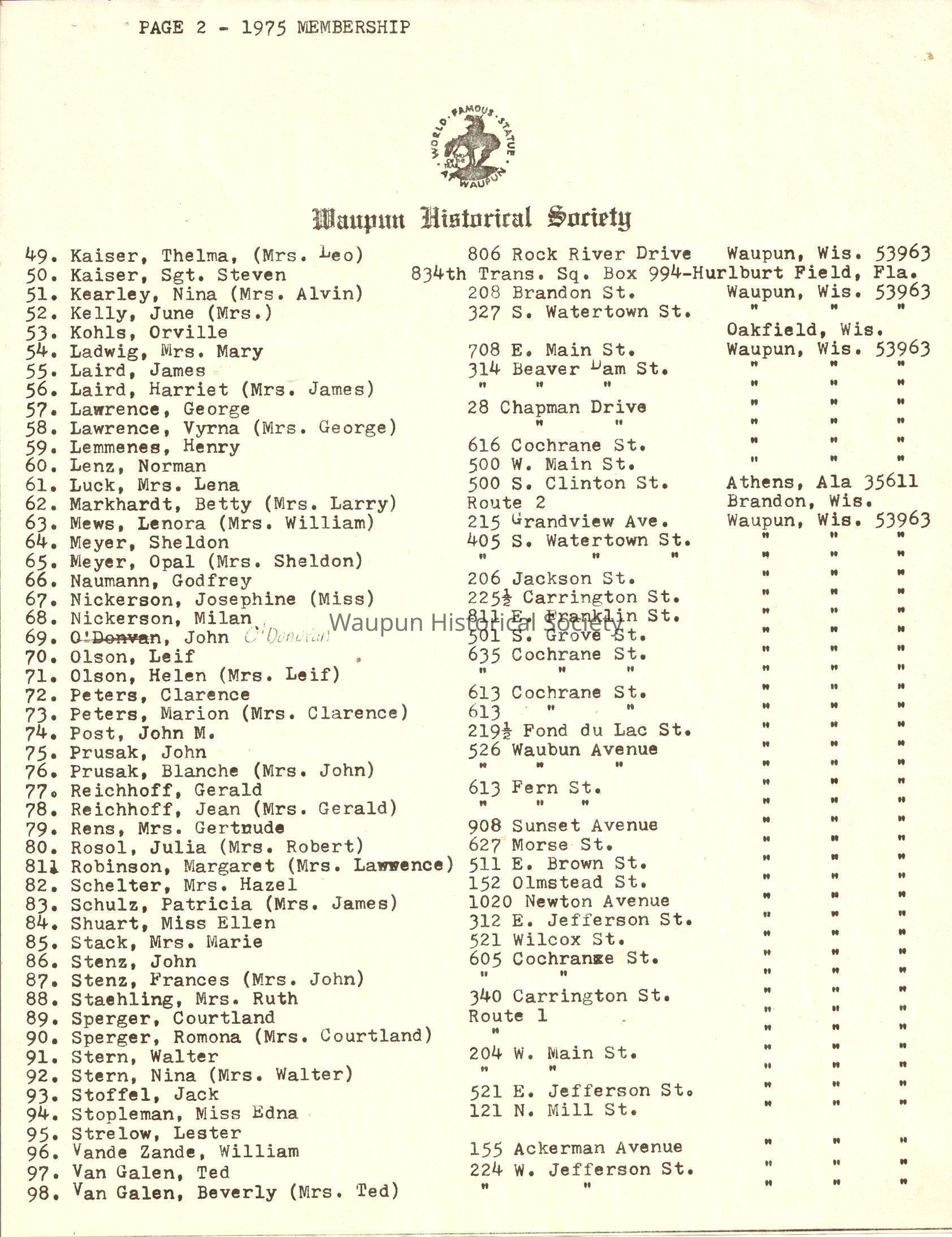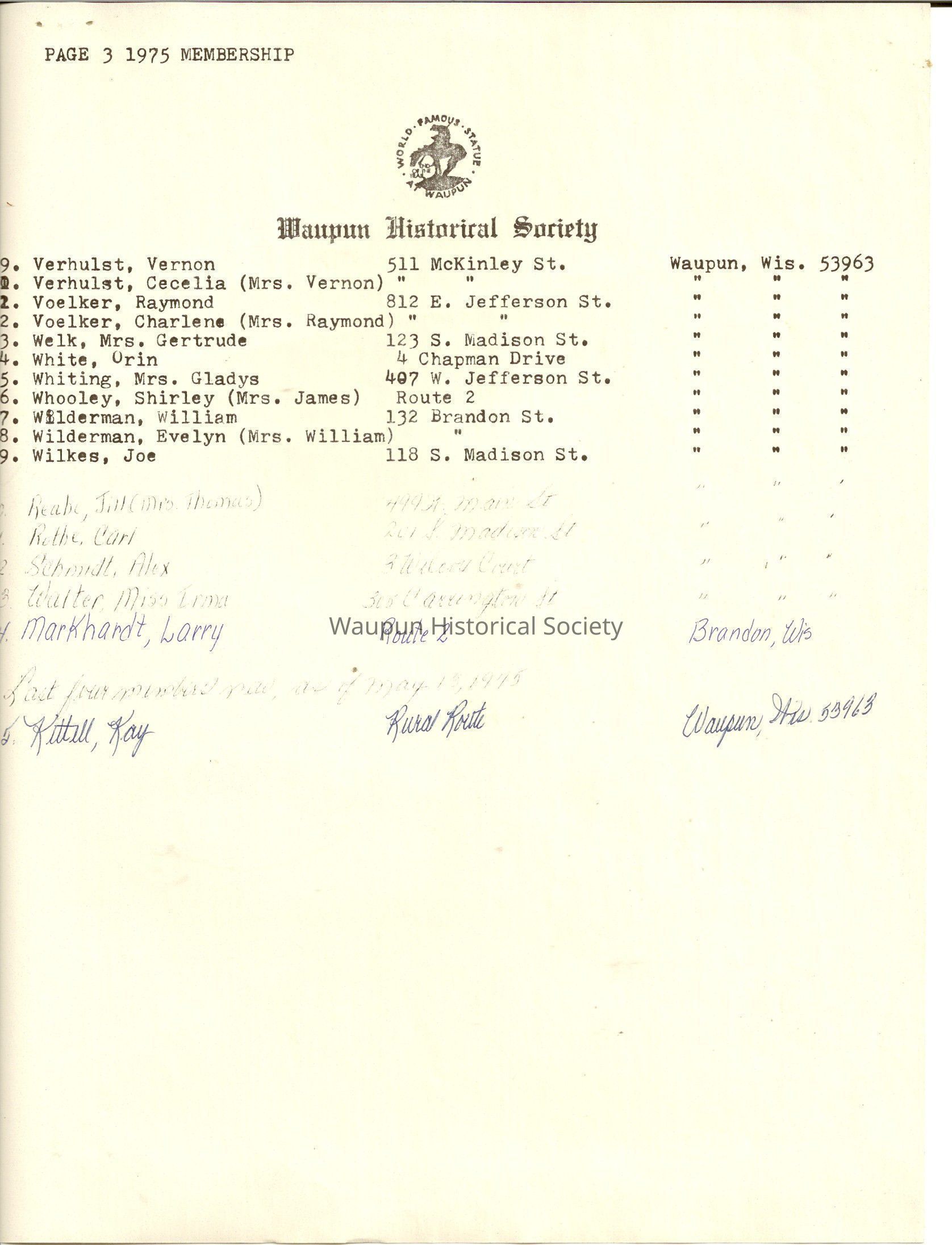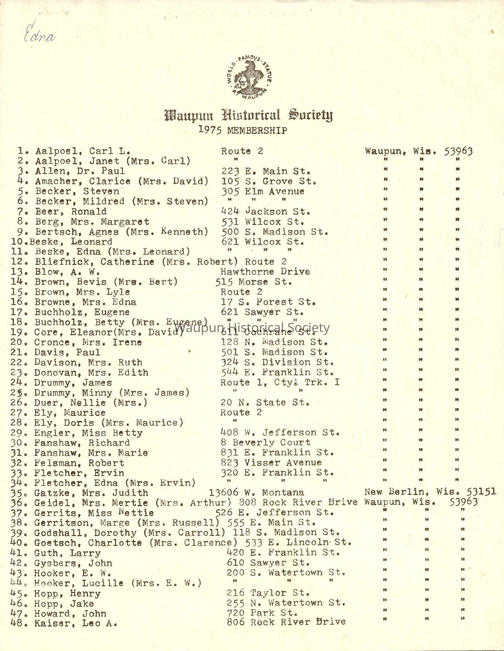 Waupun Historical Society, The Membership List of 1975Entry/Object ID