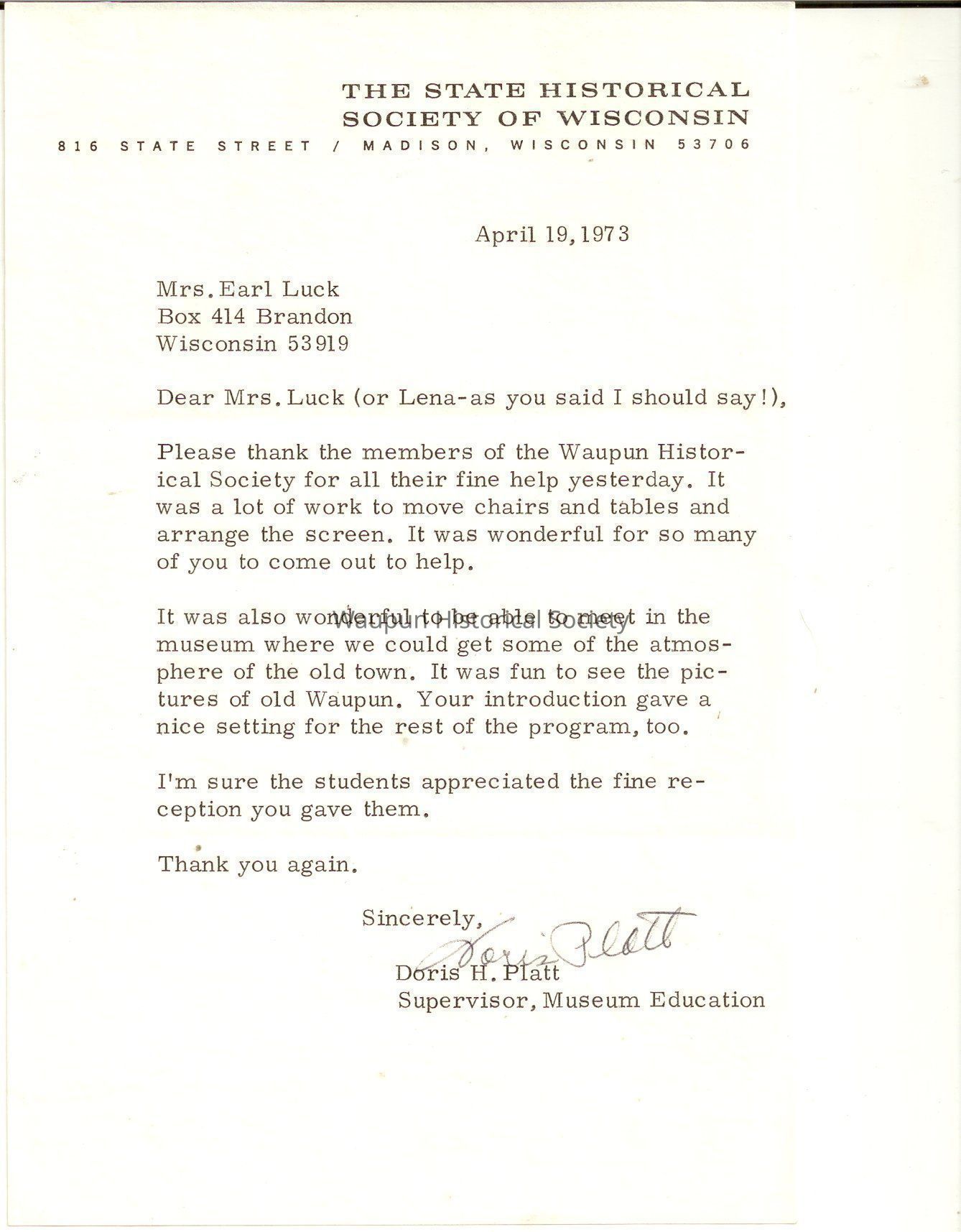 A Letter is to thank the member of Waupun Historical Society for all their fine help yeaterday in moving the chair and table and arrange the screen and be able to meet in the museum where we can get some atmosphere of the Old town.Acquisition