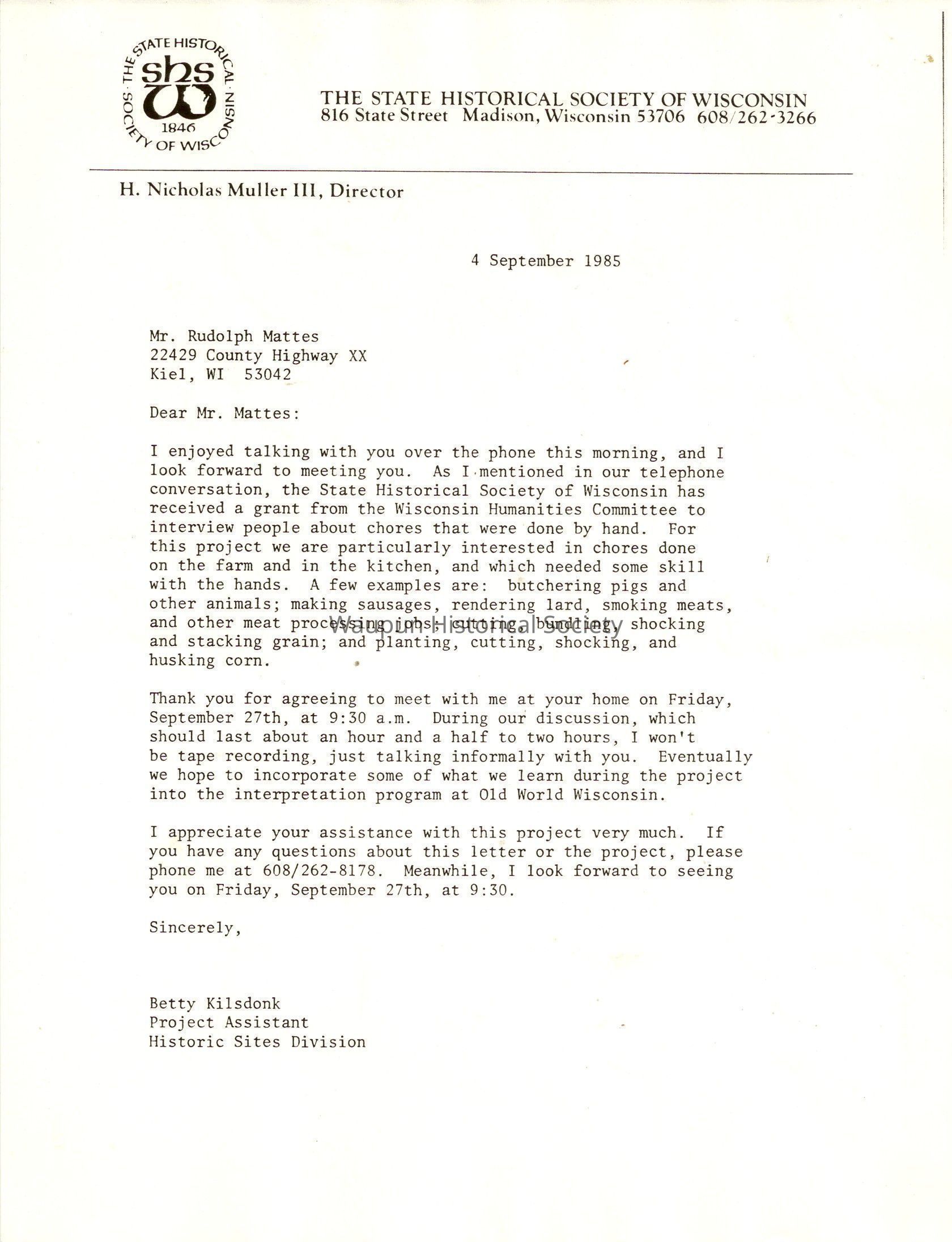 I enjoyed talking with you over the phone this morning, and I look forward to meeting you. As I mentioned in our telephone conversation, the State Historical Society of Wisconsin has received a grant from the Wisconsin Humanities Committee to interview people about chores that were done by hand. For this project we are particularly interested in chores done on the farm and in the kitchen, and which needed some skill with the hands.