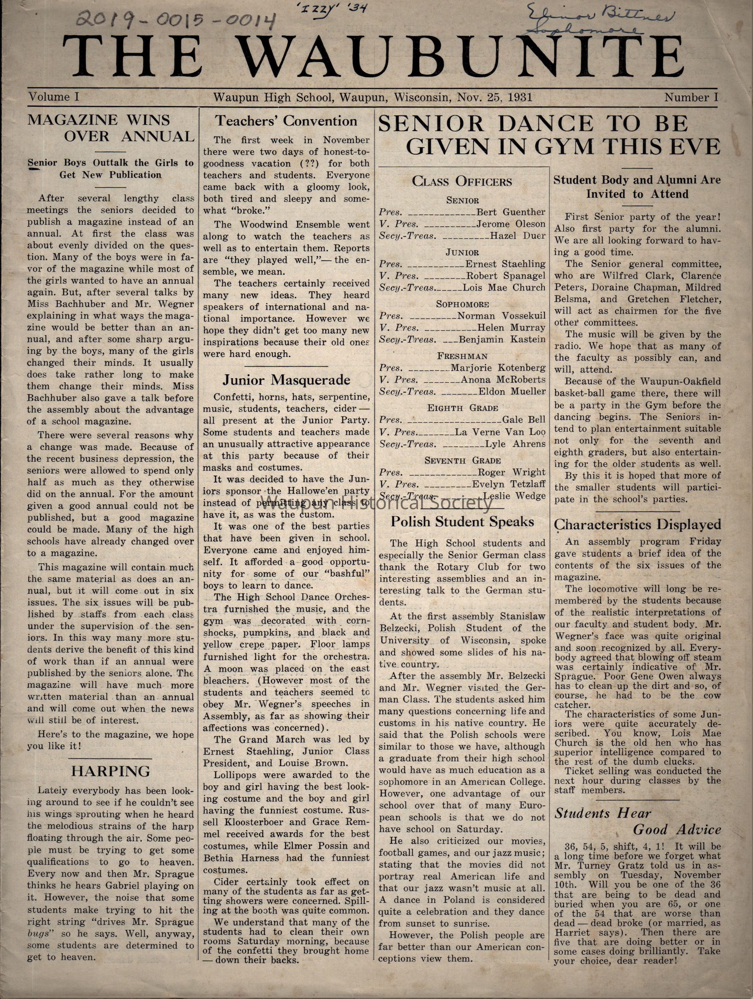 THE WAUBUNITE Newspaper NOV 25 1931 (Waupun H.S)Acquisition
