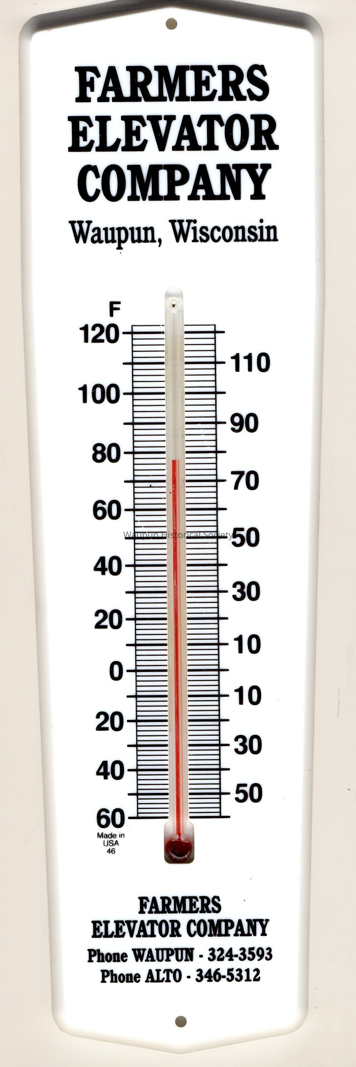 Plastic Thermometer given out by Farmers Elevator Company in Waupun. It is located at 2 West Main, right next to the railroad track on Main Street.Acquisition