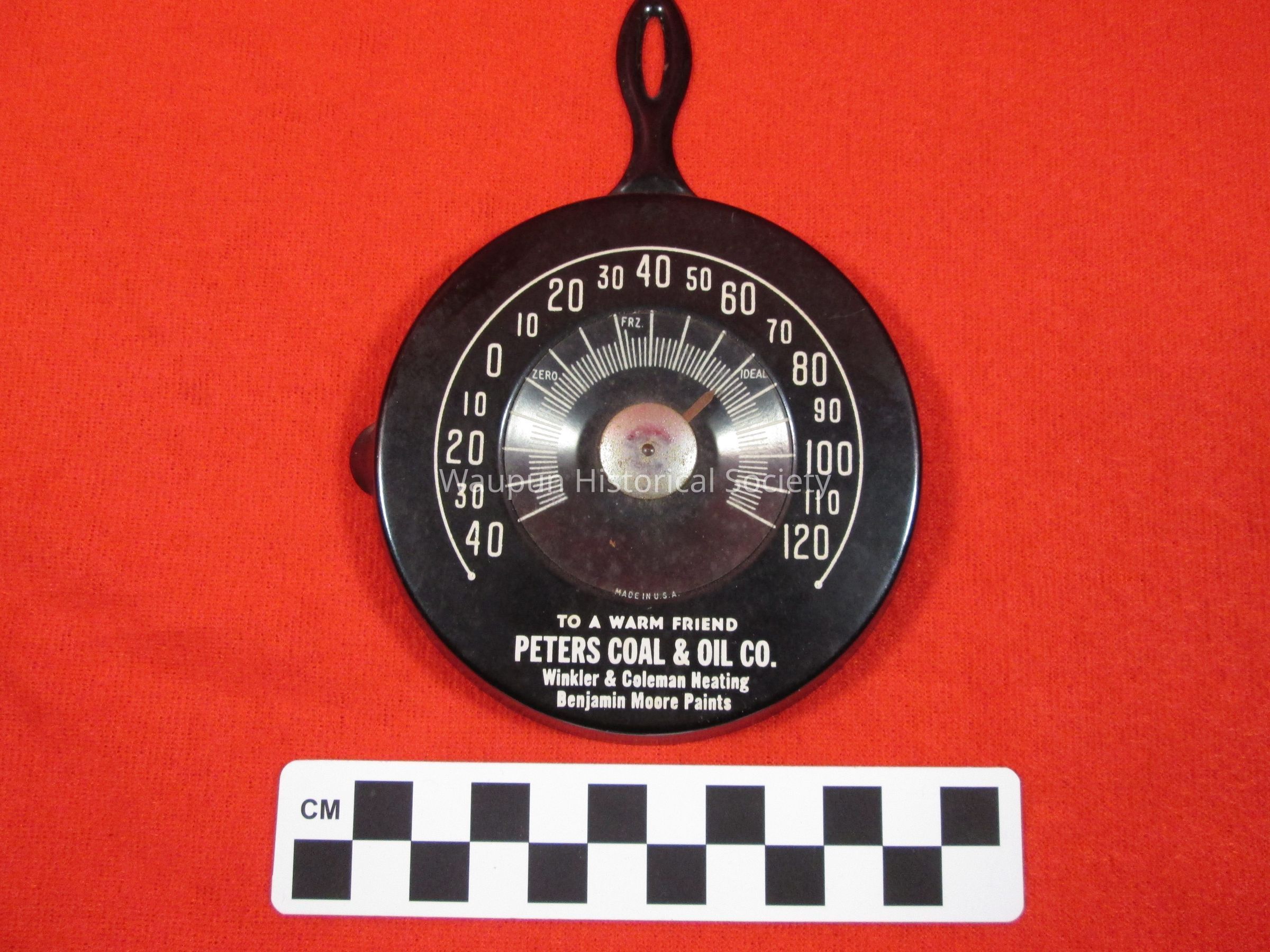 Thermometer in the shape of a small black frying pan, advertising Peters Coal & Oil Co., Winkler & Coleman Heating, Benjamin Moore Paints. Appears that it could be hung by the handle.Acquisition