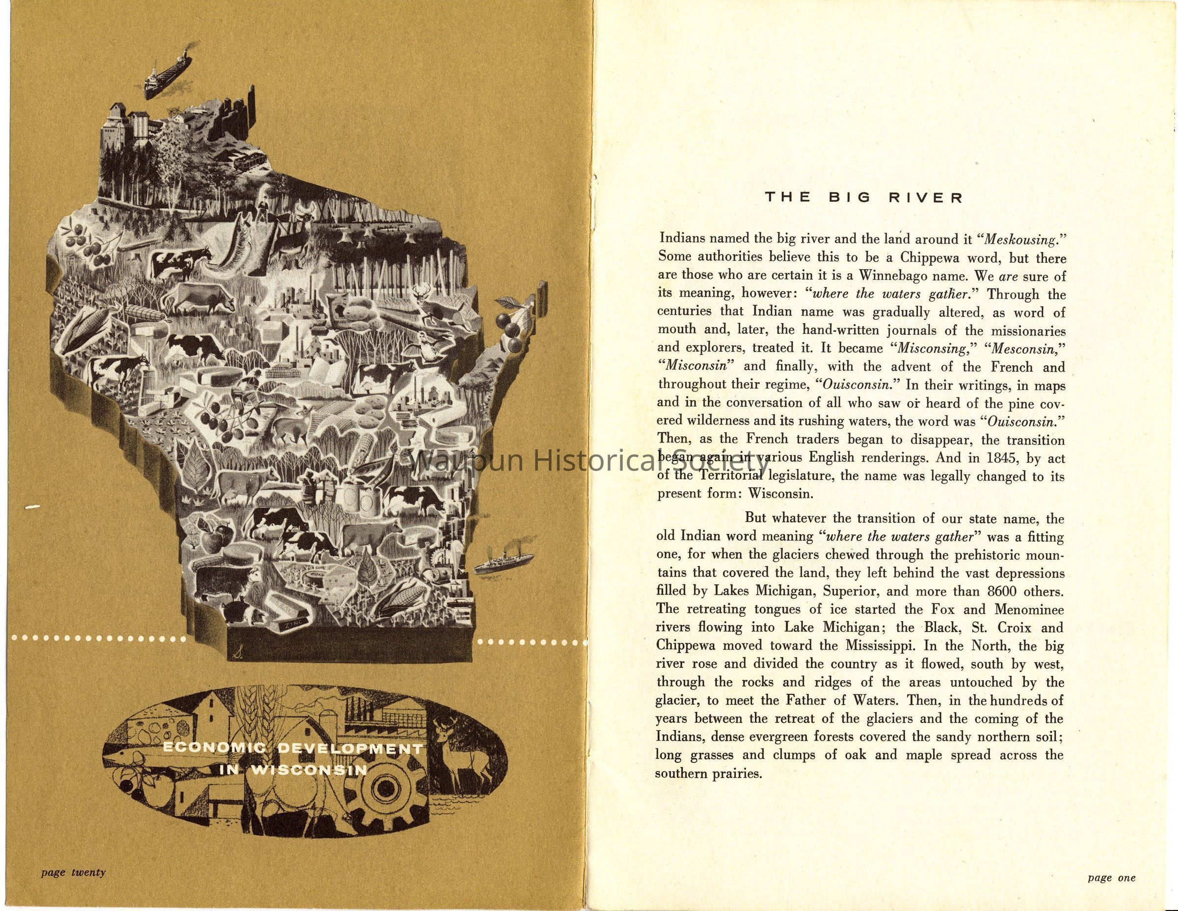 Indians named the big river and the land around it "Meskousing." Some authorities believe this to be a Chippewa word, but there are those who are certain it is a Winnebago name. We are sure of its meaning, however: "where the waters gather." Through the centuries that Indian name was gradually altered, as word of mouth and, later, the hand-written journals of the missionaries and explorers, treated it. It became "Misconsing," "Mesconsin," "Misconsin" and finally, with the advent of the French and throughout their regime, "Ouisconsin." In their writings, in maps and in the conversation of all who saw o"r heard of the pine covered wilderness and its rushing waters, the word was "Ouisconsin." Then, as the French traders began to disappear, the transition began again in various English renderings. And in 1845, by act of the Territorial legislature, the name was legally changed to its present form: Wisconsin.