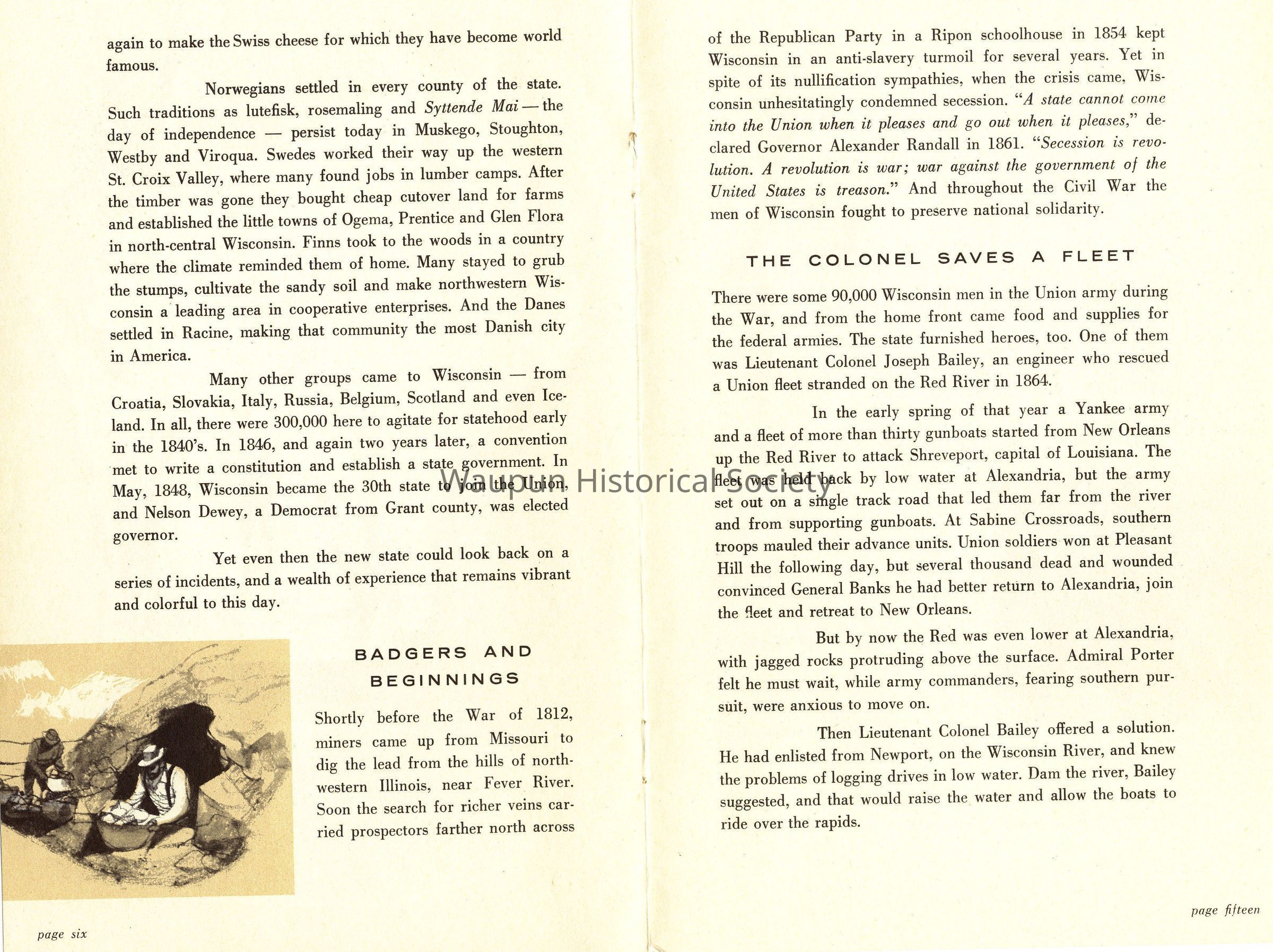 Many other groups came to Wisconsin - from Croatia, Slovakia, Italy, Russia, Belgium, Scotland and even Iceland. In all, there were 300,000 here to agitate for statehood early in the 1840's. In 1846, and again two years later, a convention met to write a constitution and establish a state government. In May, 1848, Wisconsin became the 30th state to join the Union, and Nelson Dewey, a Democrat from Grant county, was elected governor.