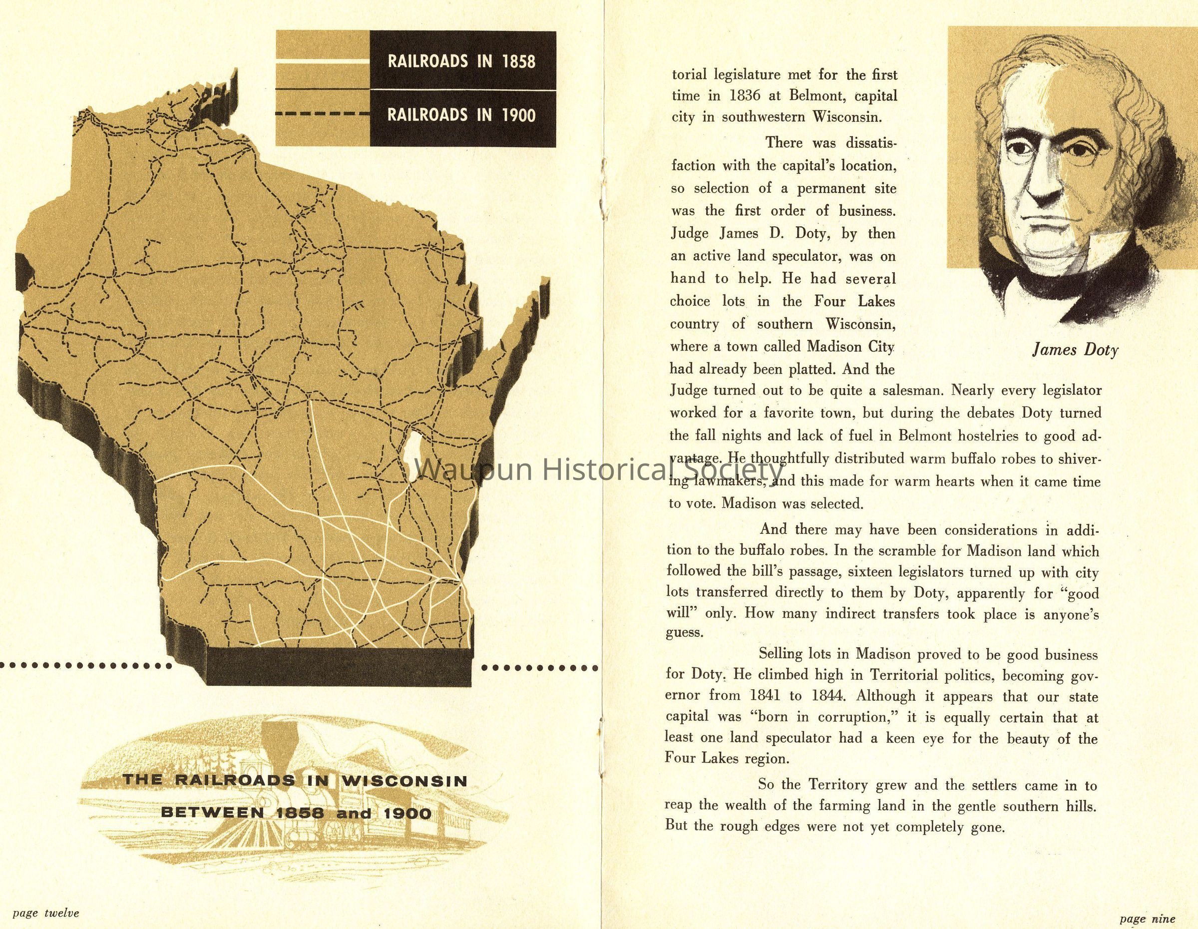 There was dissatisfaction with the capital's location, so selection of a permanent site was the first order of business. Judge James D. Doty, by then an active land speculator, was on hand to help. He had several choice lots in the Four Lakes country of southern Wisconsin, where a town called Madison City had already been platted. And the Judge turned out to be quite a salesman. Nearly every legislator worked for a favorite town, but during the debates Doty turned the fall nights and lack of fuel in Belmont hostelries to good advantage. He thoughtfully distributed warm buffalo robes to shivering lawmakers, and this made for warm hearts when it came time to vote. Madison was selected.