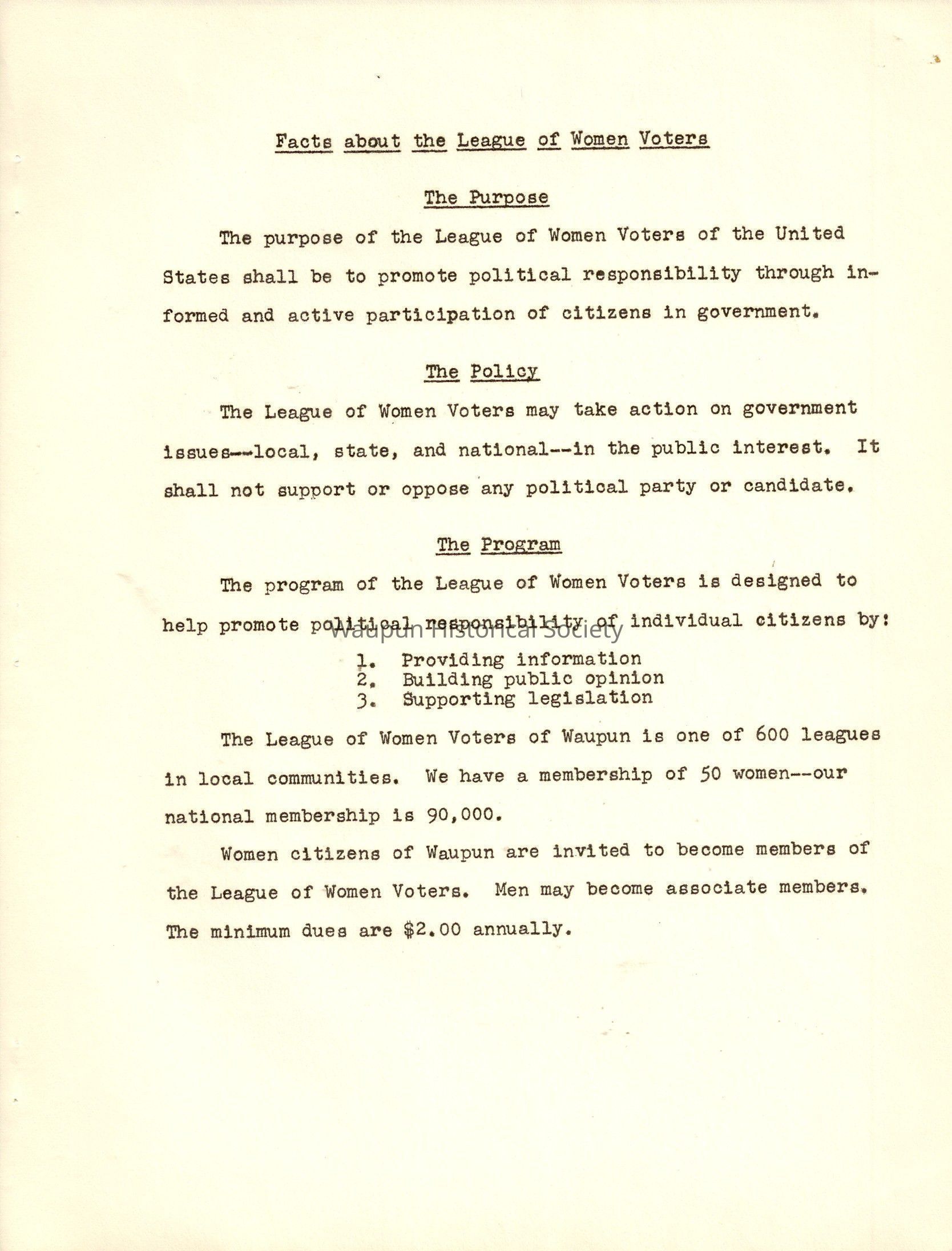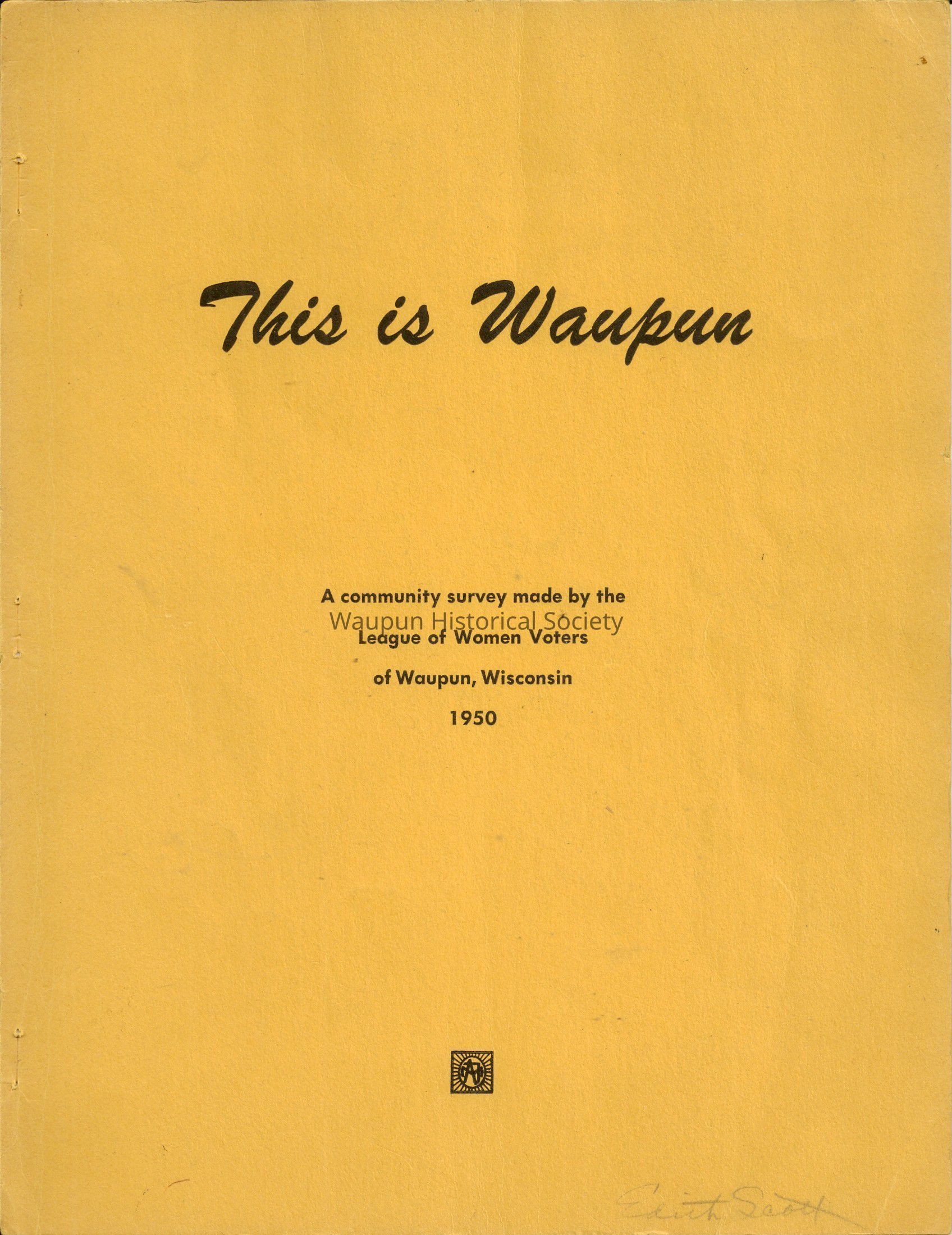 "This is Waupun" is a 26 page typed document with gold colored card stock quality front and back covers, stapled together in book form. With black print, the front cover describes the document as "A community survey made by the League of Women Voters of Waupun, Wisconsin" 1950. The name Edith Scott is written on the front cover, (lower right corner) in pencil.