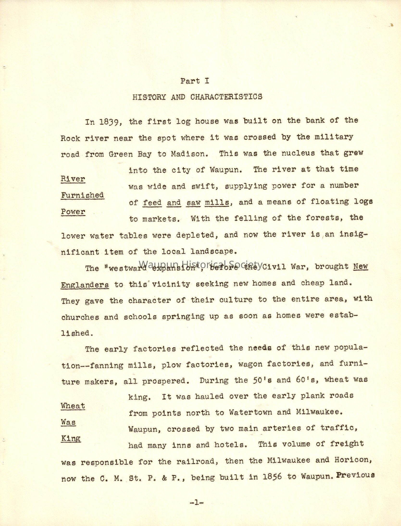 In 1839, the first log house was built on the bank of the Rock river near the spot where it was crossed by the military road from Green Bay to Madison. This was the nucleus that grew into the city of Waupun. The river at that time was wide and swift, supplying power for a number of feed and saw mills, and a means of floating logs to markets. With the felling of the forests, the lower water tables were depleted, and now the river is an insignificant item of the local landscape.