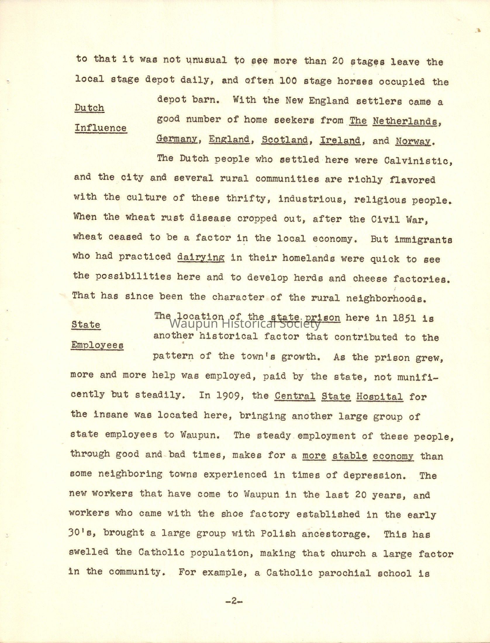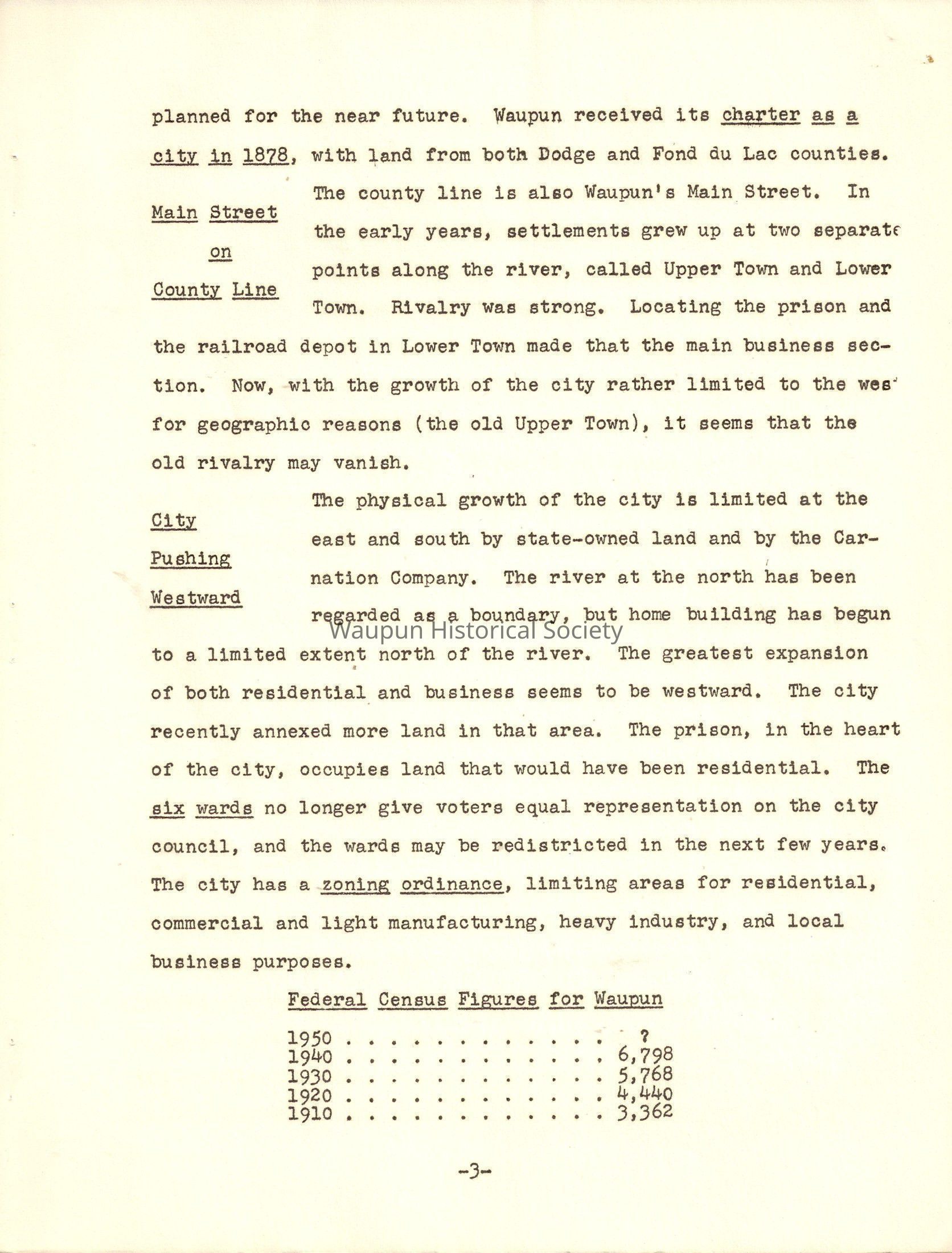 The location of the state prison here in 1851 is another historical factor that contributed to the pattern of the town's growth. As the prison grew, more and more help was employed, paid by the state, not munificently but steadily. In 1909, the Central State Hospital for the insane was located here, bringing another large group of state employees to Waupun. The steady employment of these people, through good and bad times, makes for a more stable economy than some neighboring towns experienced in times of depression. The new workers that have come to Waupun in the last 20 years, and workers who came with the shoe factory established in the early 30's, brought a large group with Polish ancestorage. This has swelled the Catholic population, making that church a large factor in the community. For example, a Catholic parochial school is planned for the near future. Waupun received its charter as a city in 1878, with land from both Dodge and Fond du Lac counties.