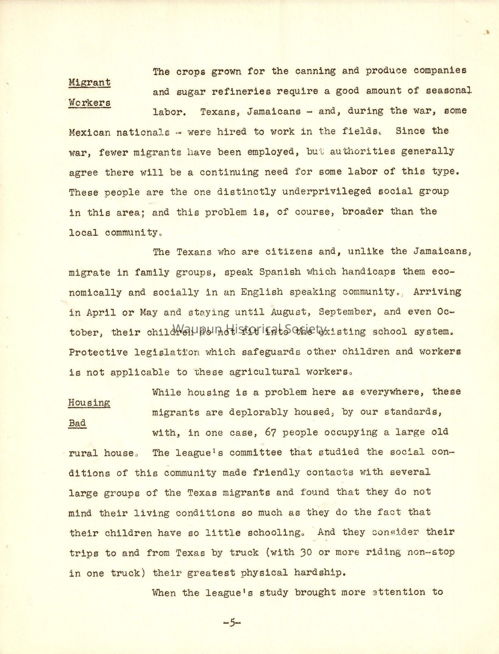 While housing is a problem here as everywhere, these migrants are deplorably housed; by our standards, with, in one case, 67 people occupying a large old rural house. The league's committee that studied the social conditions of this community made friendly contacts with several large groups of the Texas migrants and found that they do not mind their living conditions so much as they do the fact that their children have so little schooling. And they consider their trips to and from Texas by truck (with 30 or more riding non-stop in one truck) their greatest physical hardship.