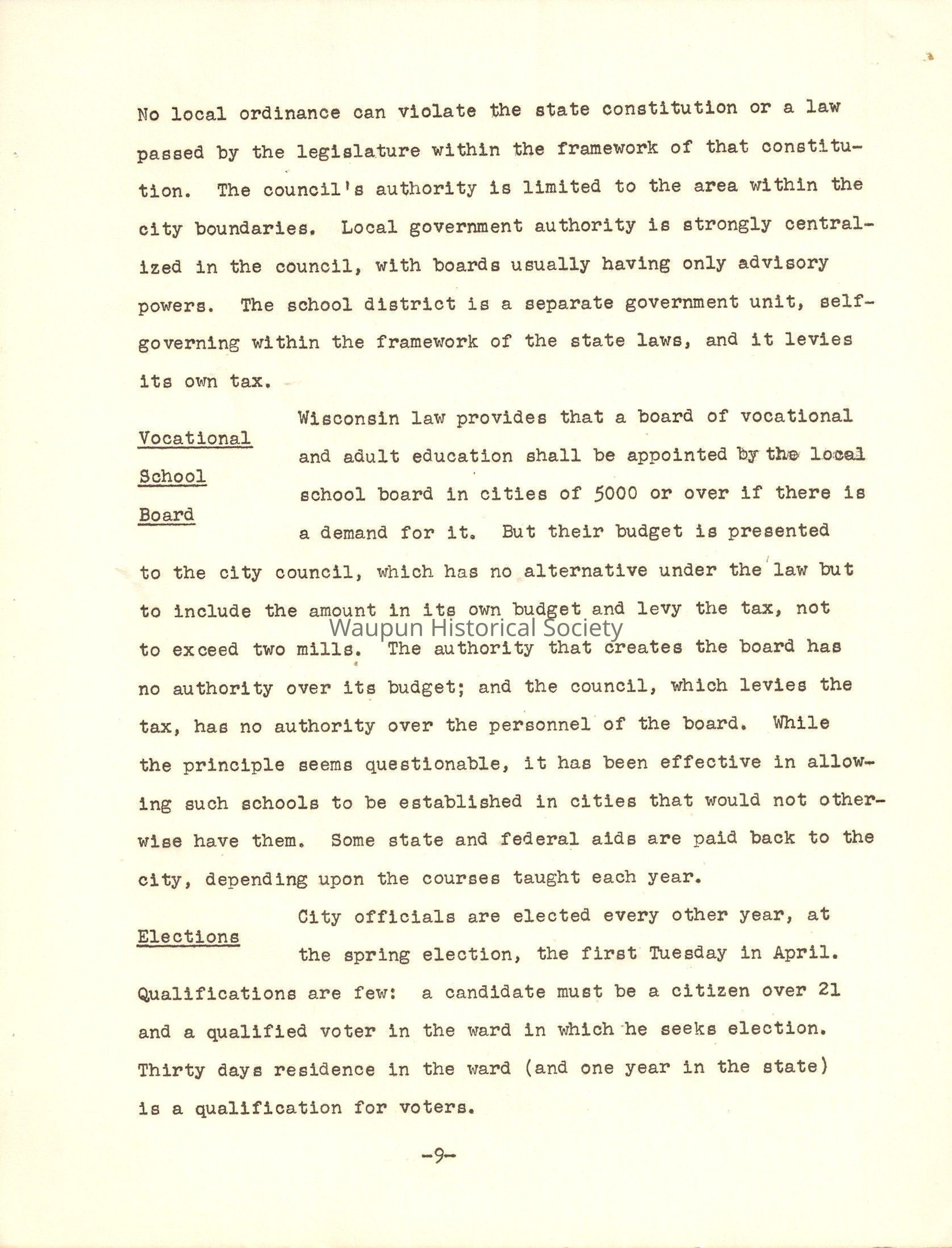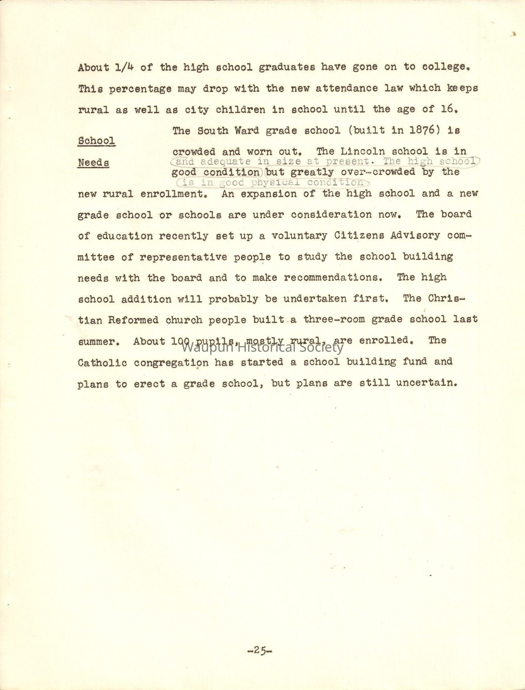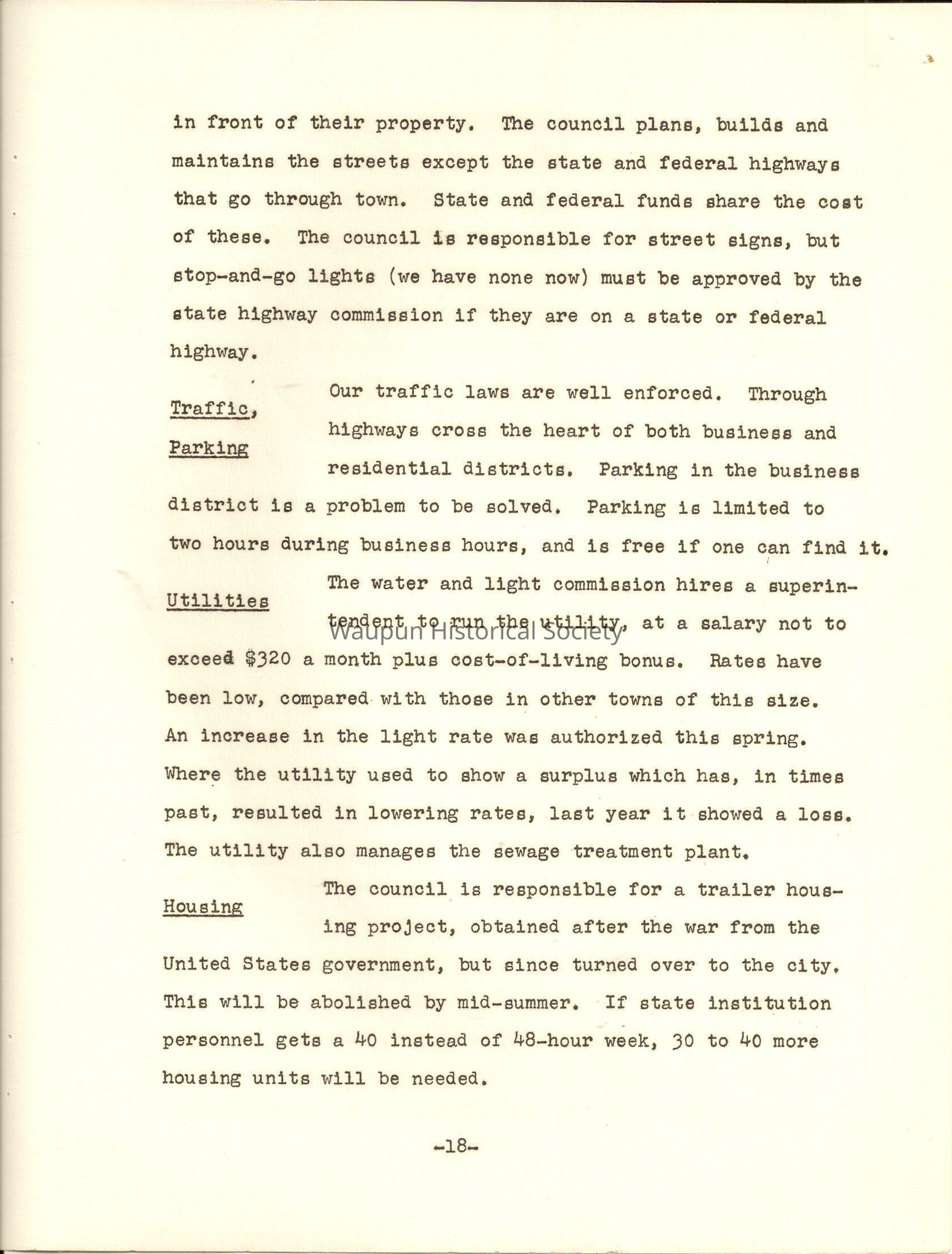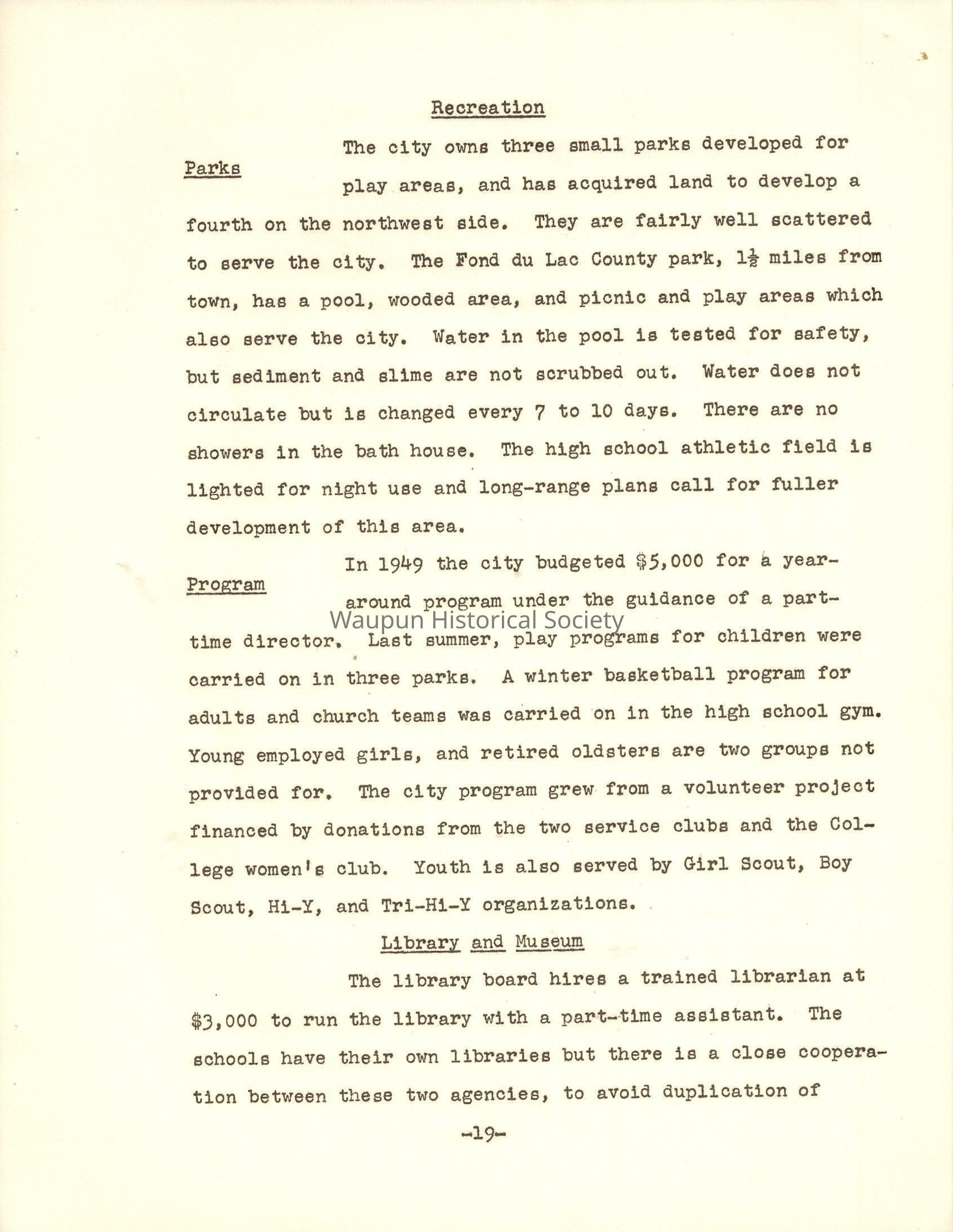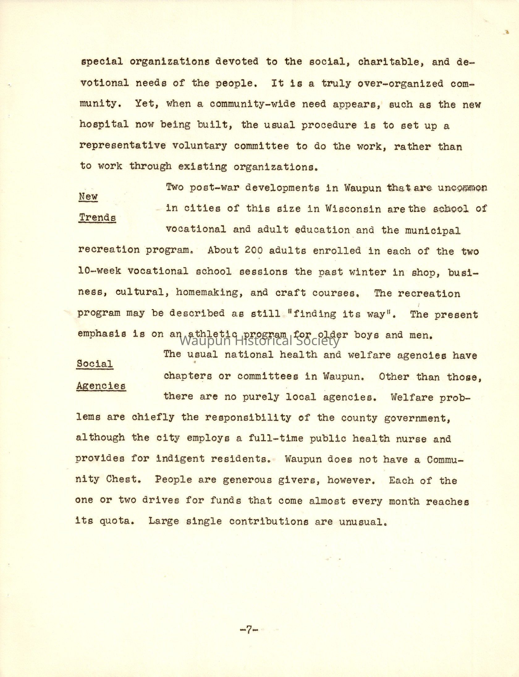 Two post-war developments in Waupun that are uncommon in cities of this size in Wisconsin are the school of vocational and adult education and the municipal recreation program. About 200 adults enrolled in each of the two 10-week vocational school sessions the past winter in shop, business, cultural, homemaking, and craft courses. The recreation program may be described as still "finding its way". The present emphasis is on an athletic program for older boys and men.