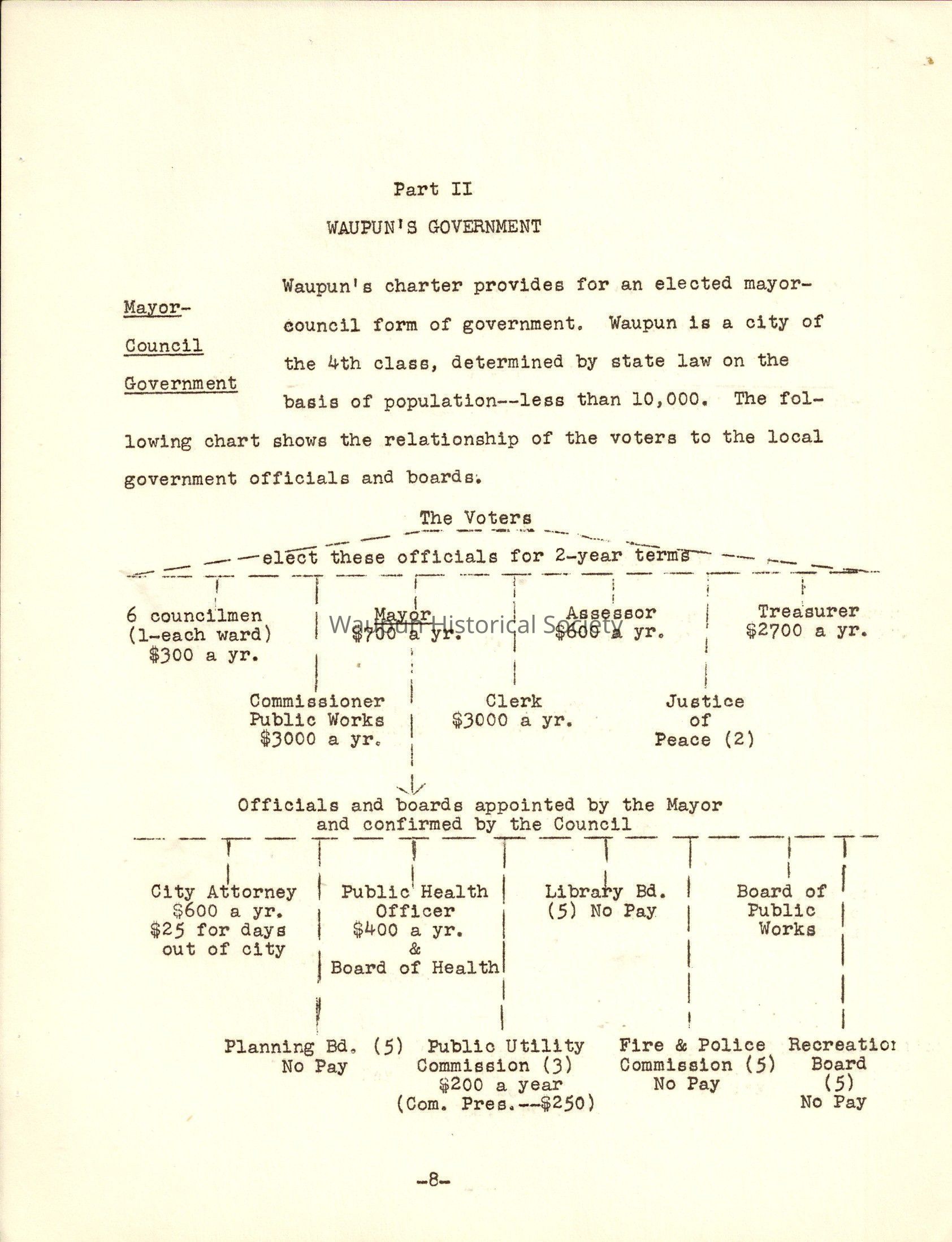 Waupun's charter provides for an elected mayor-council form of government. Waupun is a city of the 4th class, determined by state law on the basis of population--less than 10,000. The fol-