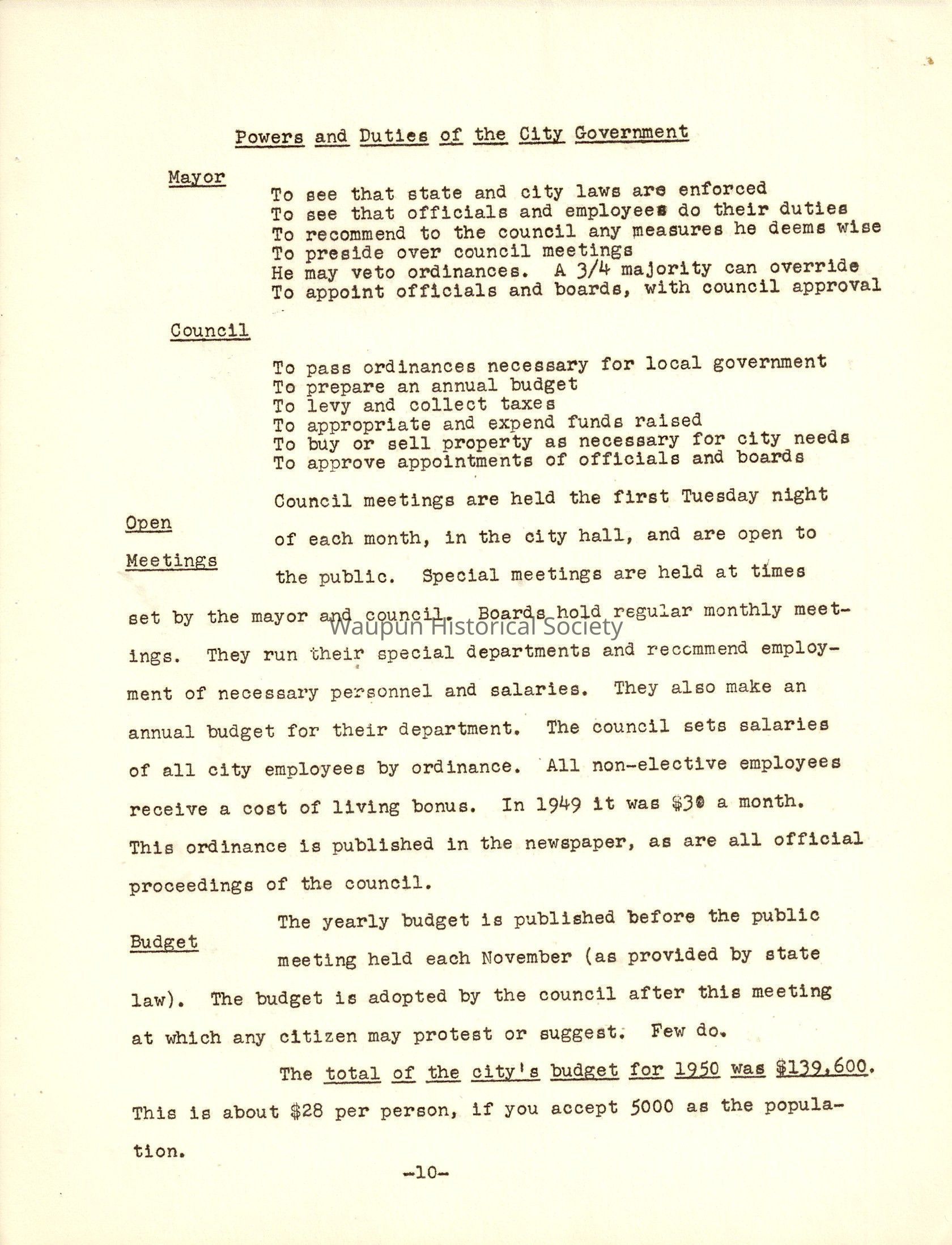 The total of the city's budget for 1950 was $139,600. This is about $28 per person, if you accept 5000 as the population.
