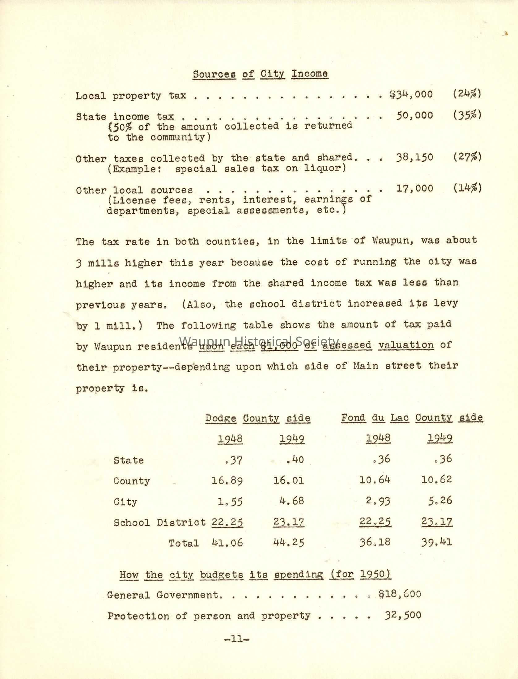 The tax rate in both counties, in the limits of Waupun, was about 3 mills higher this year because the cost of running the city was higher and its income from the shared income tax was less than previous years. (Also, the school district increased its levy by 1 mill.) The following table shows the amount of tax paid by Waupun residents upon each $1,000 of assessed valuation of their property--depending upon which side of Main street their property is.