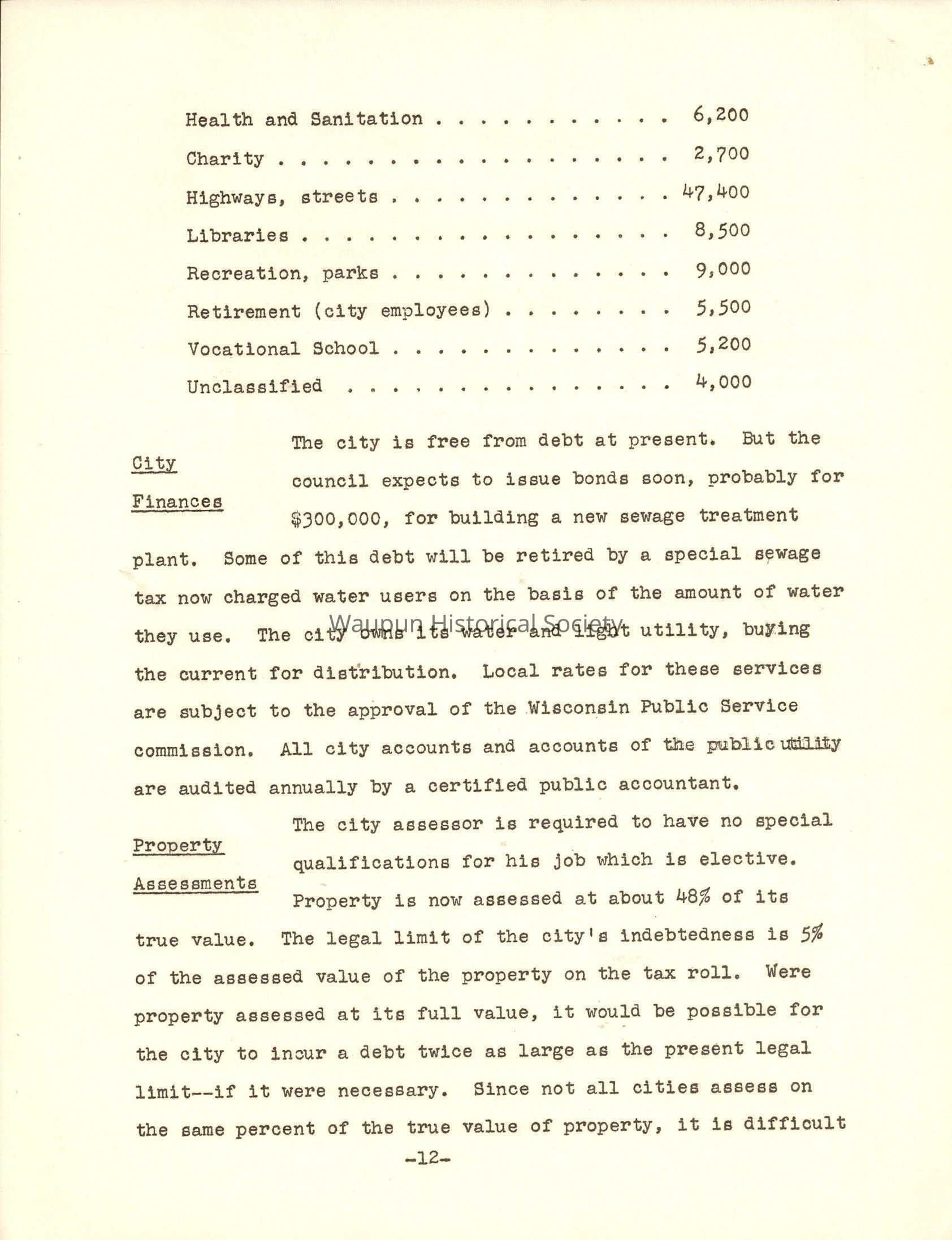 The city is free from debt at present. But the council expects to issue bonds soon, probably for $300,000, for building a new sewage treatment plant. Some of this debt will be retired by a special sewage tax now charged water users on the basis of the amount of water they use. The city owns its water and light utility, buying the current for distribution. Local rates for these services are subject to the approval of the Wisconsin Public Service commission. All city accounts and accounts of the public unity are audited annually by a certified public accountant.
