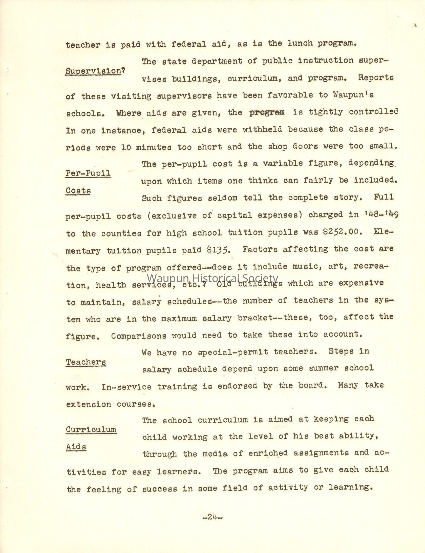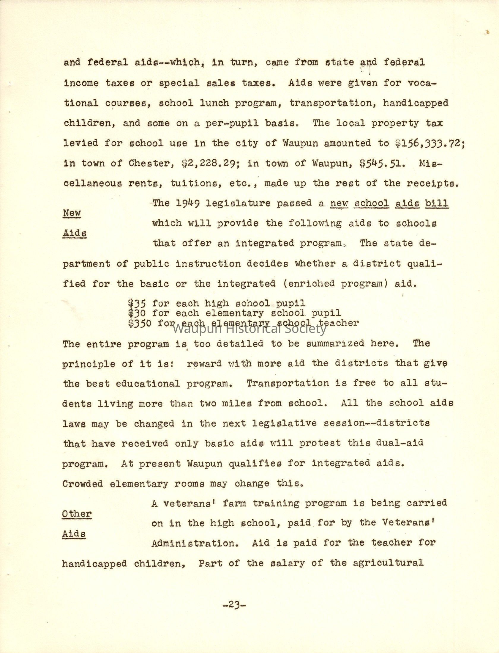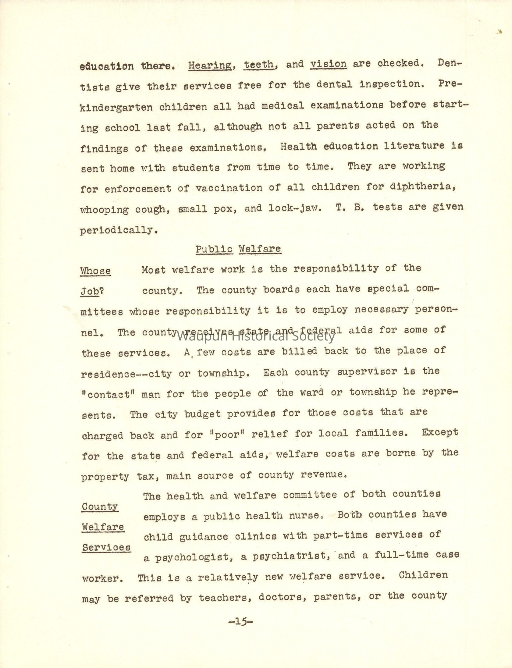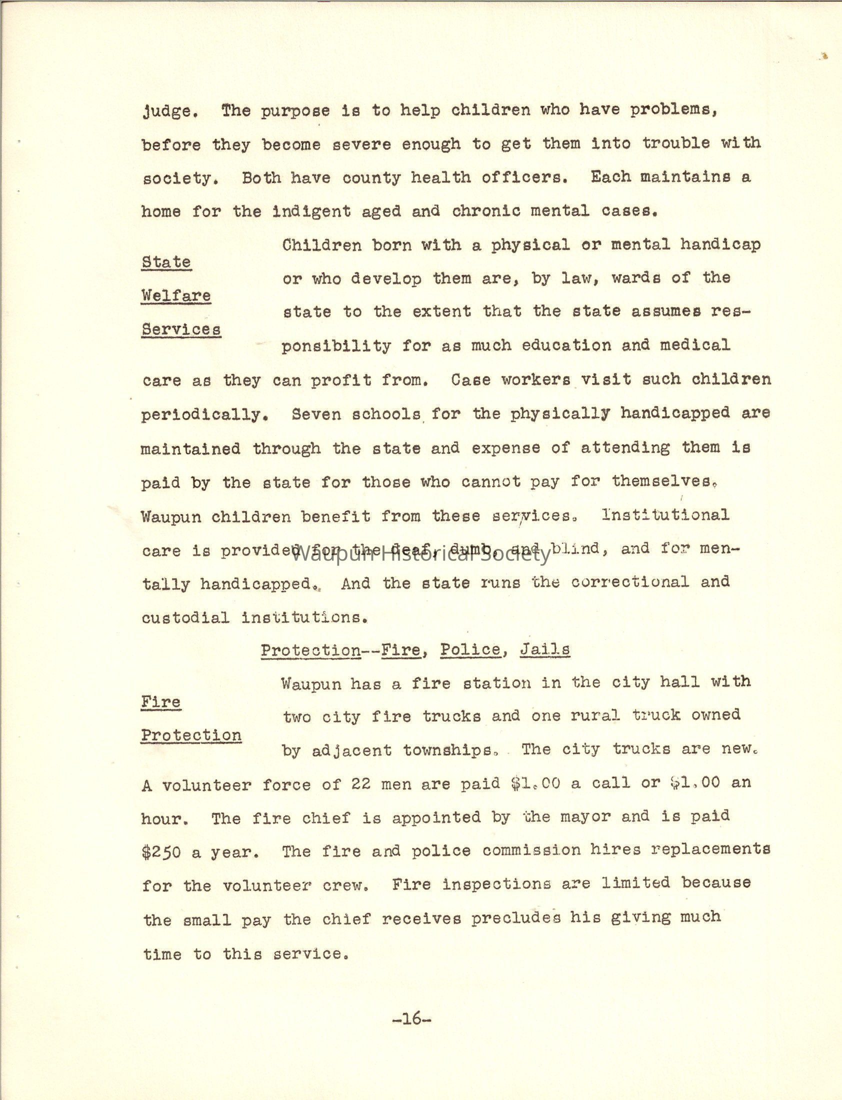 Children born with a physical or mental handicap or who develope them are, by law, wards of the state to the extent that the state assumes responsibility for as much education and medical care as they can profit from. Case Workers visit such children periodically. Seven schools for the physically handicapped are maintained through the state and expense of attending them is paid by the state for those who cannot pay for themselves. Waupun Children benefit from these services. Institutional care is provided for the deaf , dumb, and blind, and for mentally handicapped. And the state runs the correctional and custodial institutions.