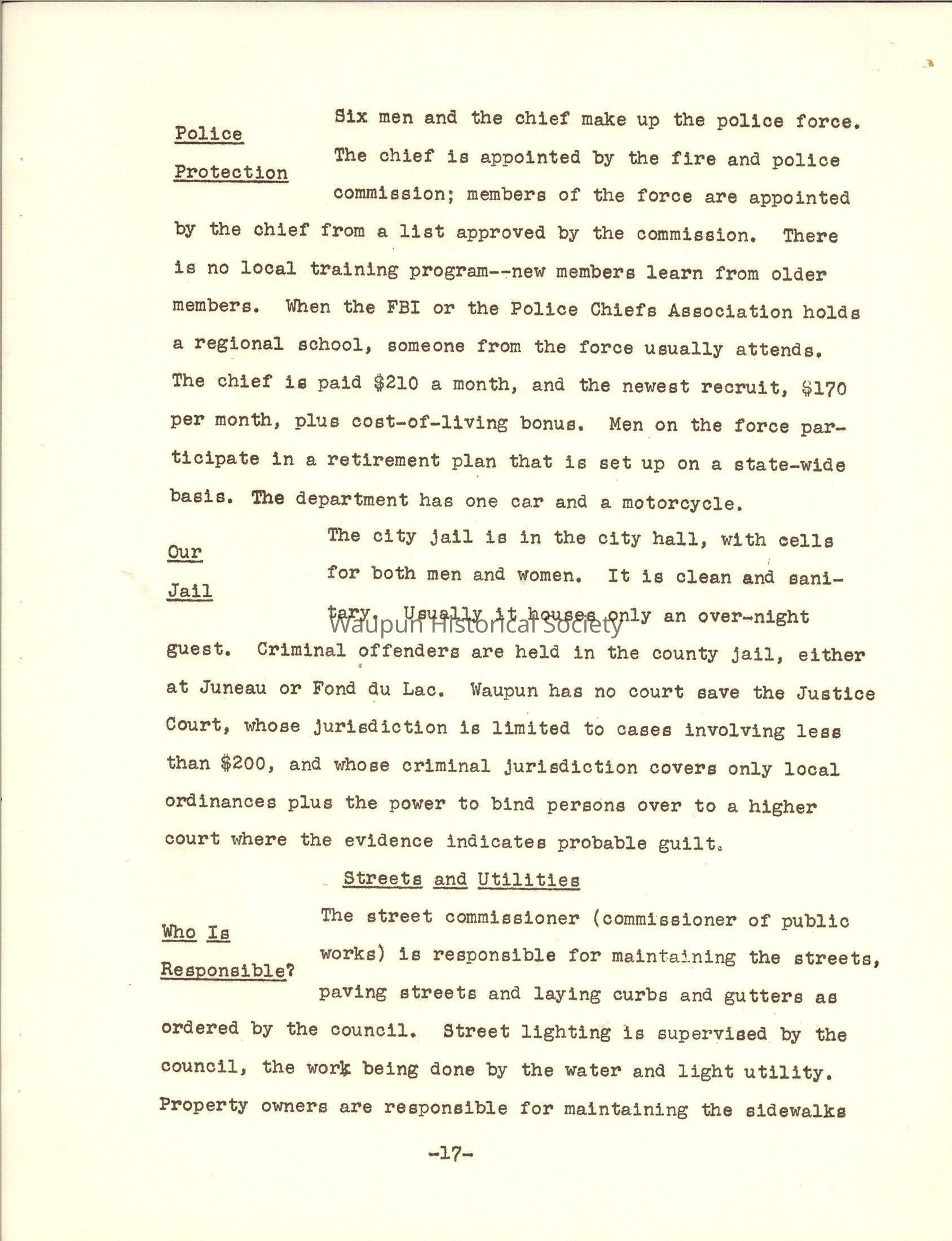 Six men and the chief make up the police force. The chief is appointed by the fire and police commission; members of the force are appointed by the chief from a list approved by the commission. There is no local training program--new members learn from older members. When the FBI or the Police Chiefs Association holds a regional school, someone from the force usually attends. The chief is paid $210 a month, and the newest recruit, $170 per month, plus cost-of-living bonus. Men on the force participate in a retirement plan that is set up on a state-wide basis. The department has one car and a motorcycle.