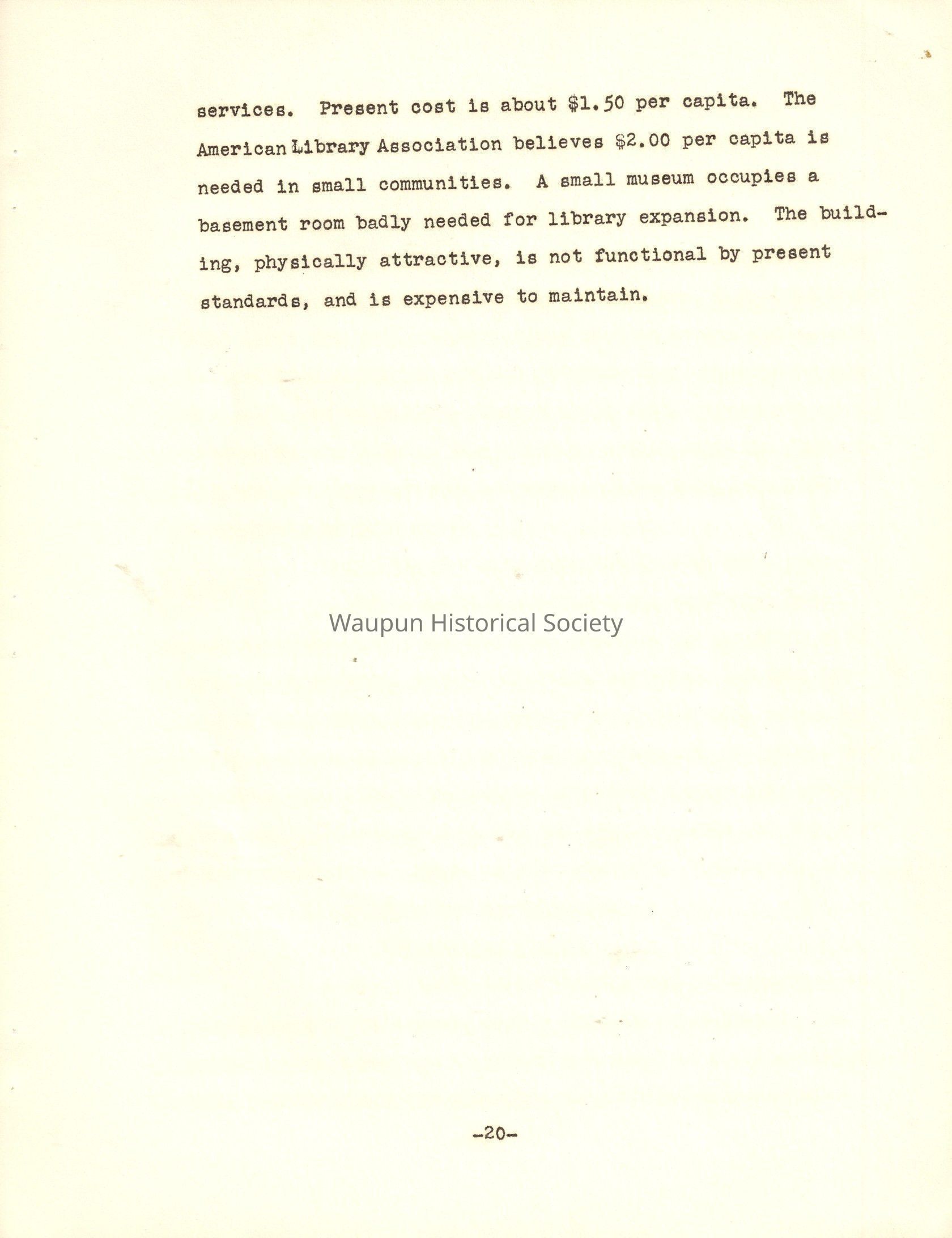 The library board hires a trained librarian at $3,000 to run the library with a part-time assistant. The schools have their own libraries but there is a close cooperation between these two agencies, to avoid duplication of services. Present cost is about $1.50 per capita. The American Library Association believes $2.00 per capita is needed in small communities. A small museum occupies a basement room badly needed for library expansion. The building, physically attractive, is not functional by present standards, and is expensive to maintain.