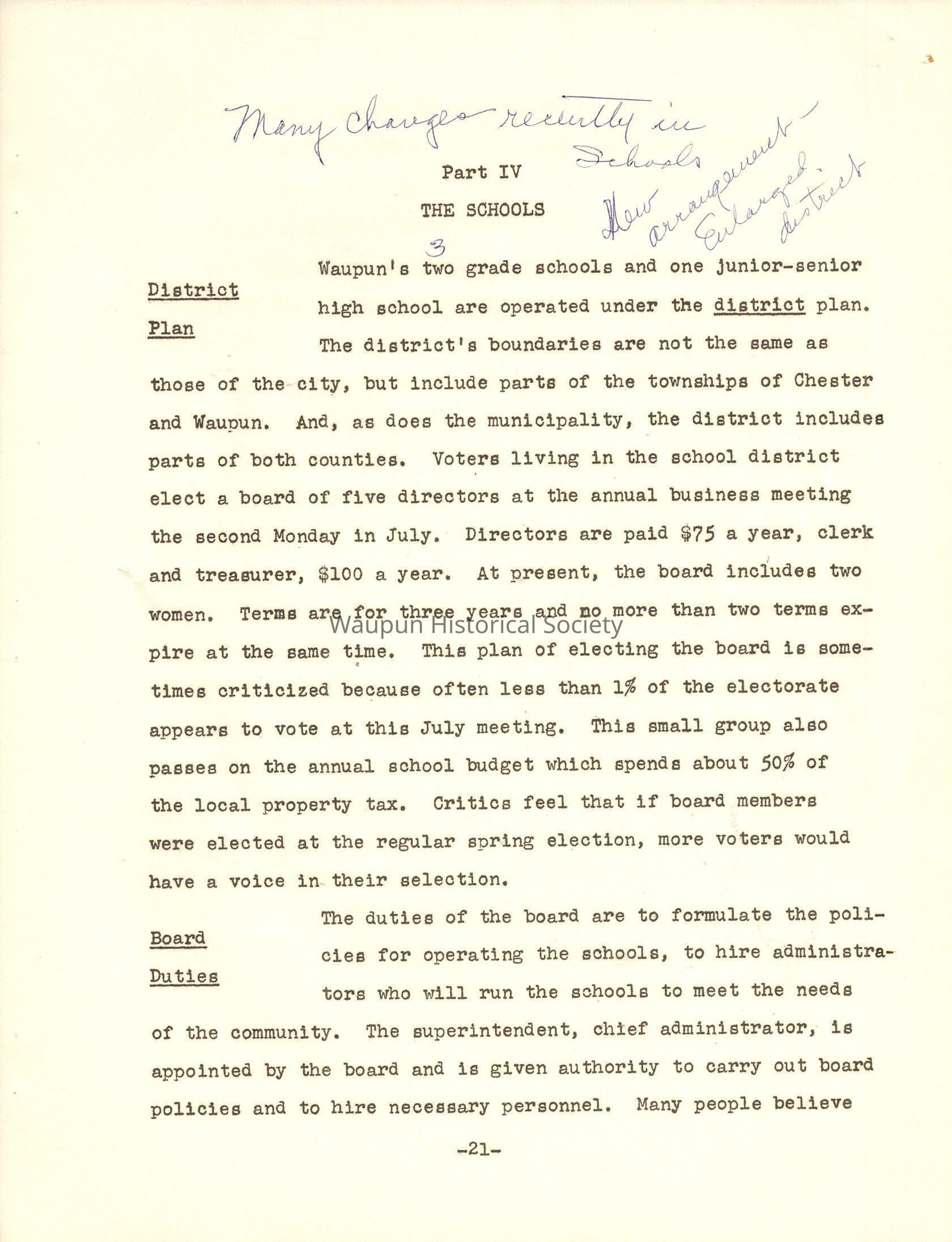 Waupun's two * correction indicated: 3 grade schools* grade schools and one junior-senior high school are operated under the district plan. The district's boundaries are not the same as those of the city, but include parts of the townships of Chester and Waupun. And, as does the municipality, the district includes parts of both counties. Voters living in the school district elect a board of five directors at the annual business meeting the second Monday in July. Directors are paid $75 a year, clerk and treasurer, $100 a year. At present, the board includes two women. Terms are for three years and no more than two terms expire at the same time. This plan of electing the board is sometimes criticized because often less than 1% of the electorate appears to vote at this July meeting. This small group also passes on the annual school budget which spends about 50% of the local property tax. Critics feel that if board members were elected at the regular spring election, more voters would have a voice in their selection.