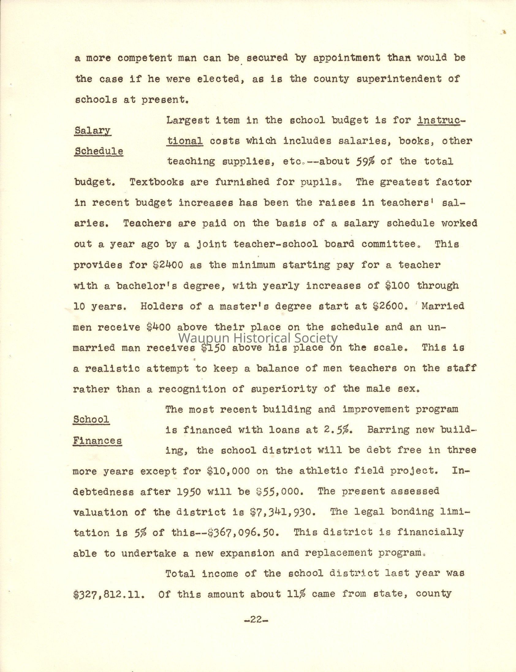 Largest item in the school budget is for instructional costs which includes salaries, books, other teaching supplies, etc,--about 59% of the total budget. Textbooks are furnished for pupils. The greatest factor in recent budget increases has been the raises in ... [truncated due to length]Acquisition