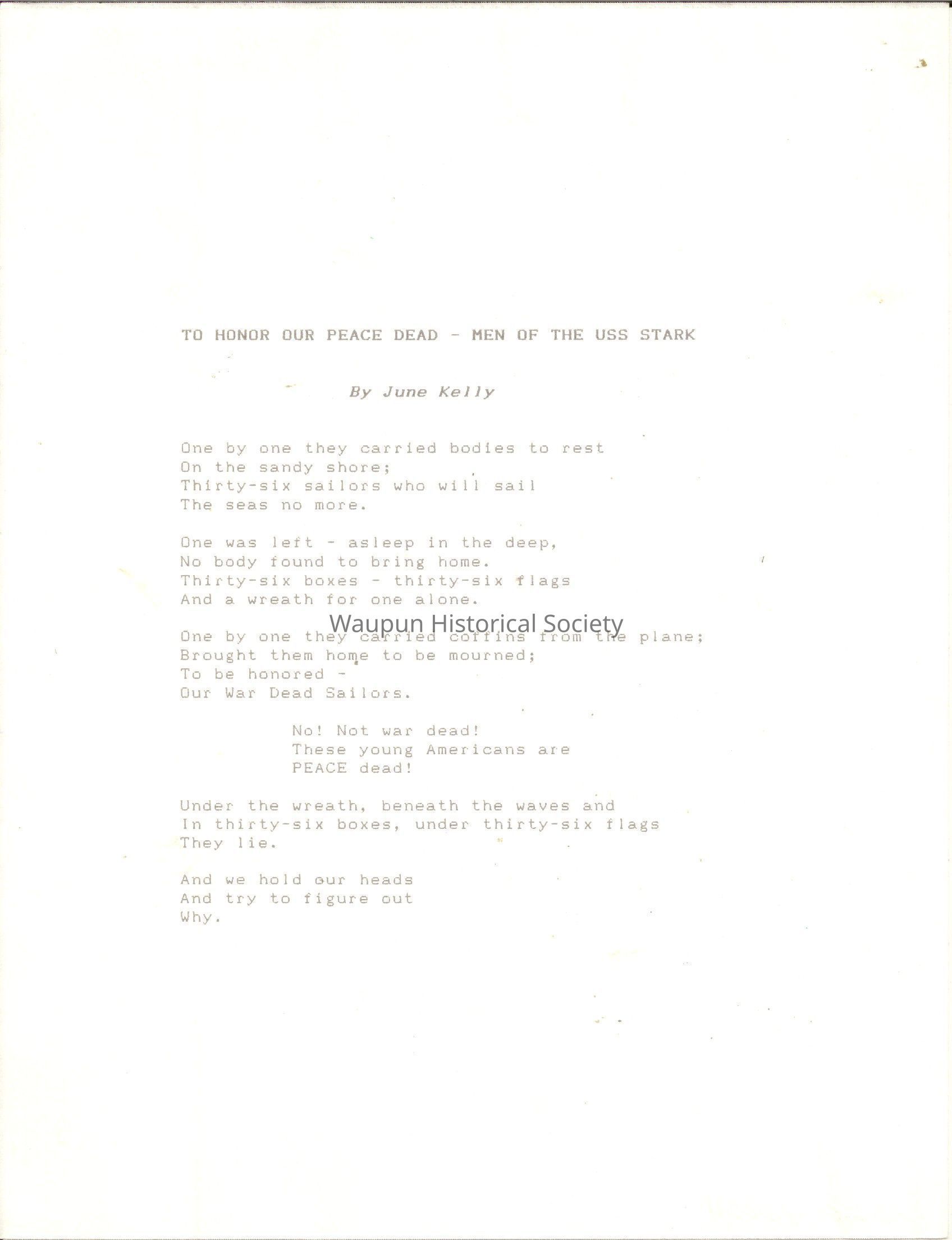 Poem, To Honor Our Peace Dead - Men of the USS Stark, June KellyEntry/Object ID