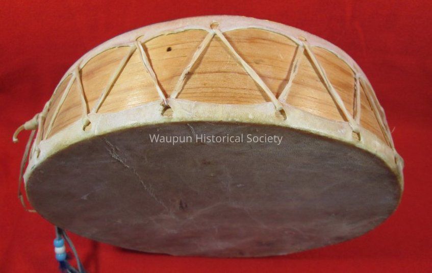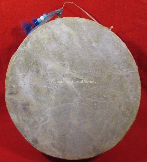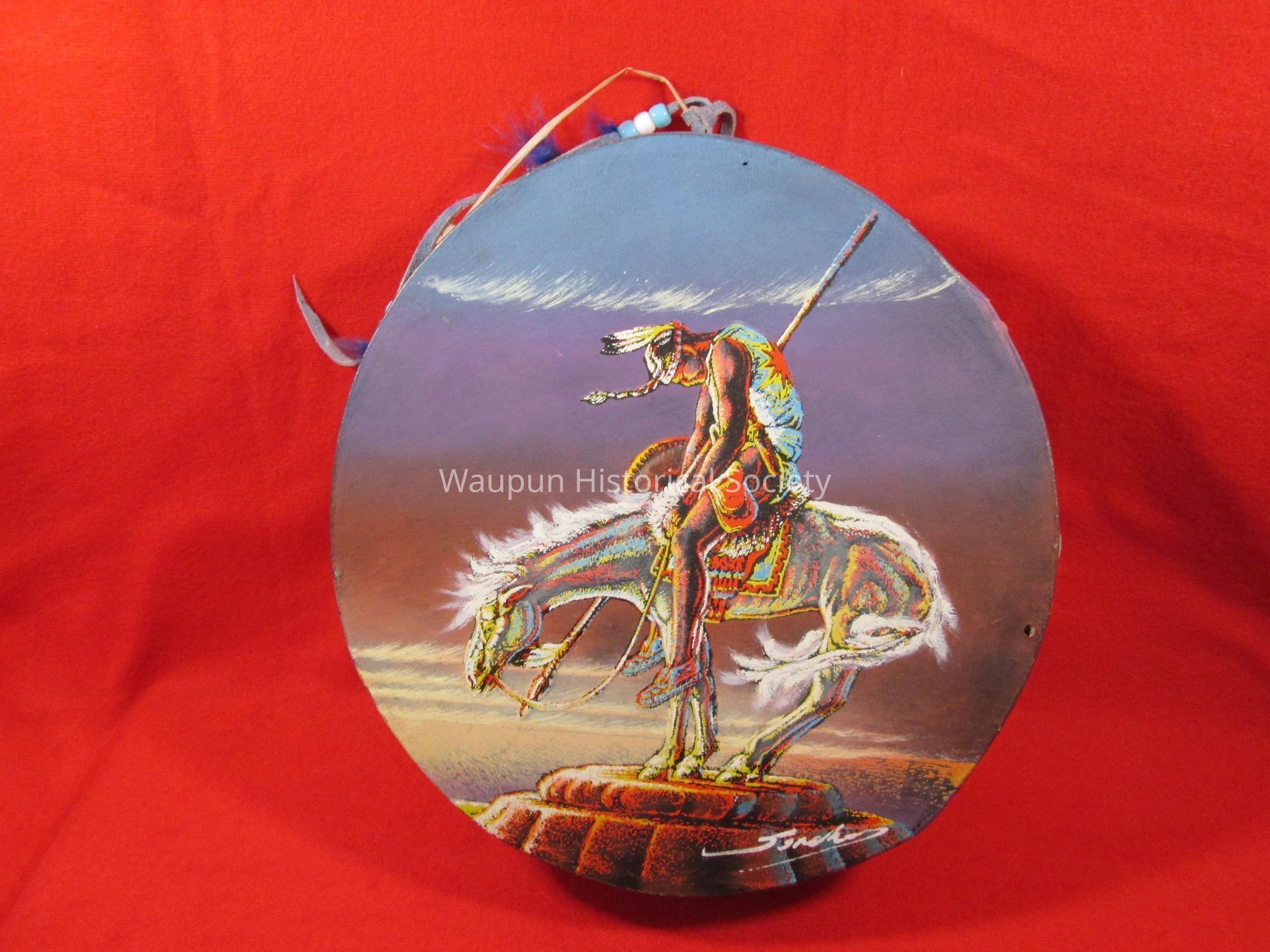 Replica of an tom-tom with End of the Trail design on front. Jim Laird bought on ebay because it indicated that was possibly made by inmates at the Waupun Prison. Appears that this was hand-painted. Could possibly used as a decorative piece to be hung on a wall as there is a hanger on top. There is an artist's name on bottom corner on front, but could not make it out.Acquisition