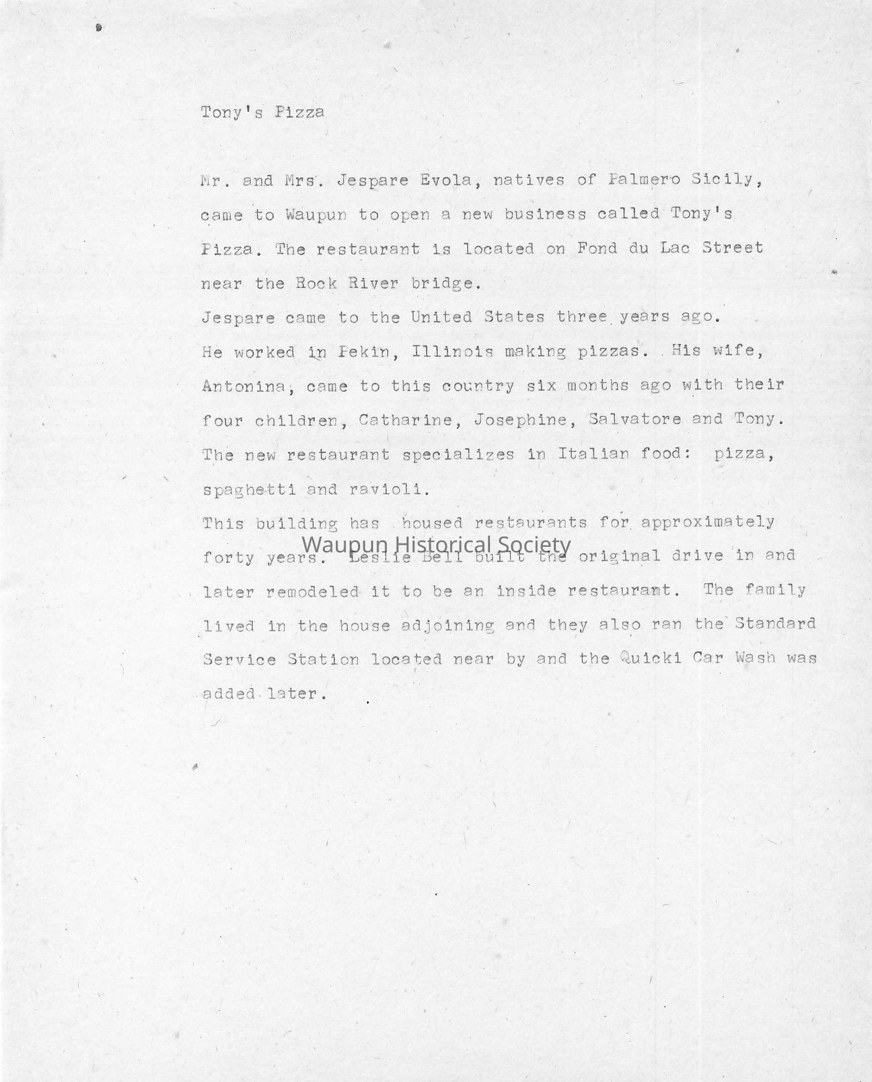 Historical information on Tony's Pizza for 1976 Bicentennial Celebration in Waupun, WI.
