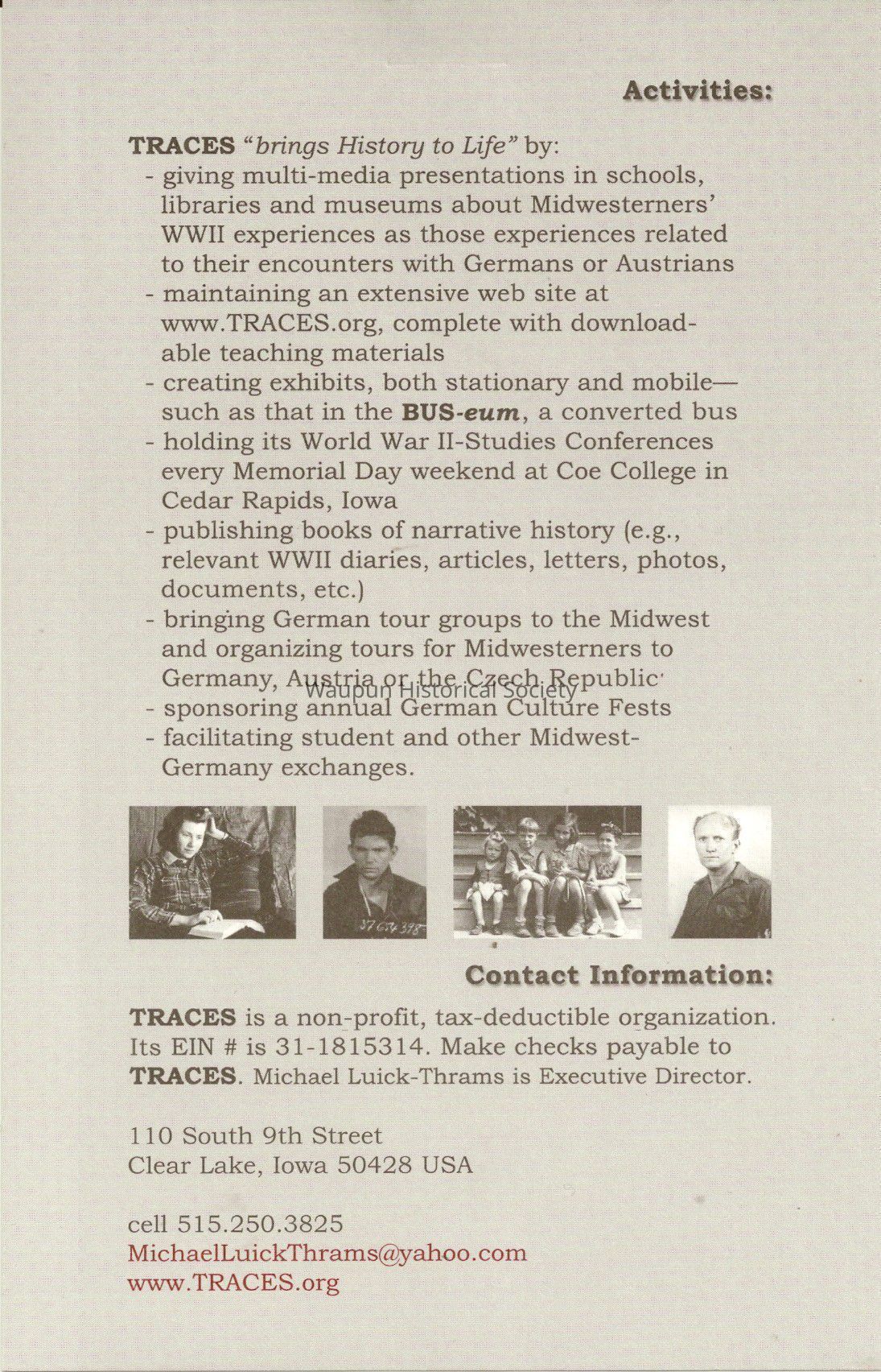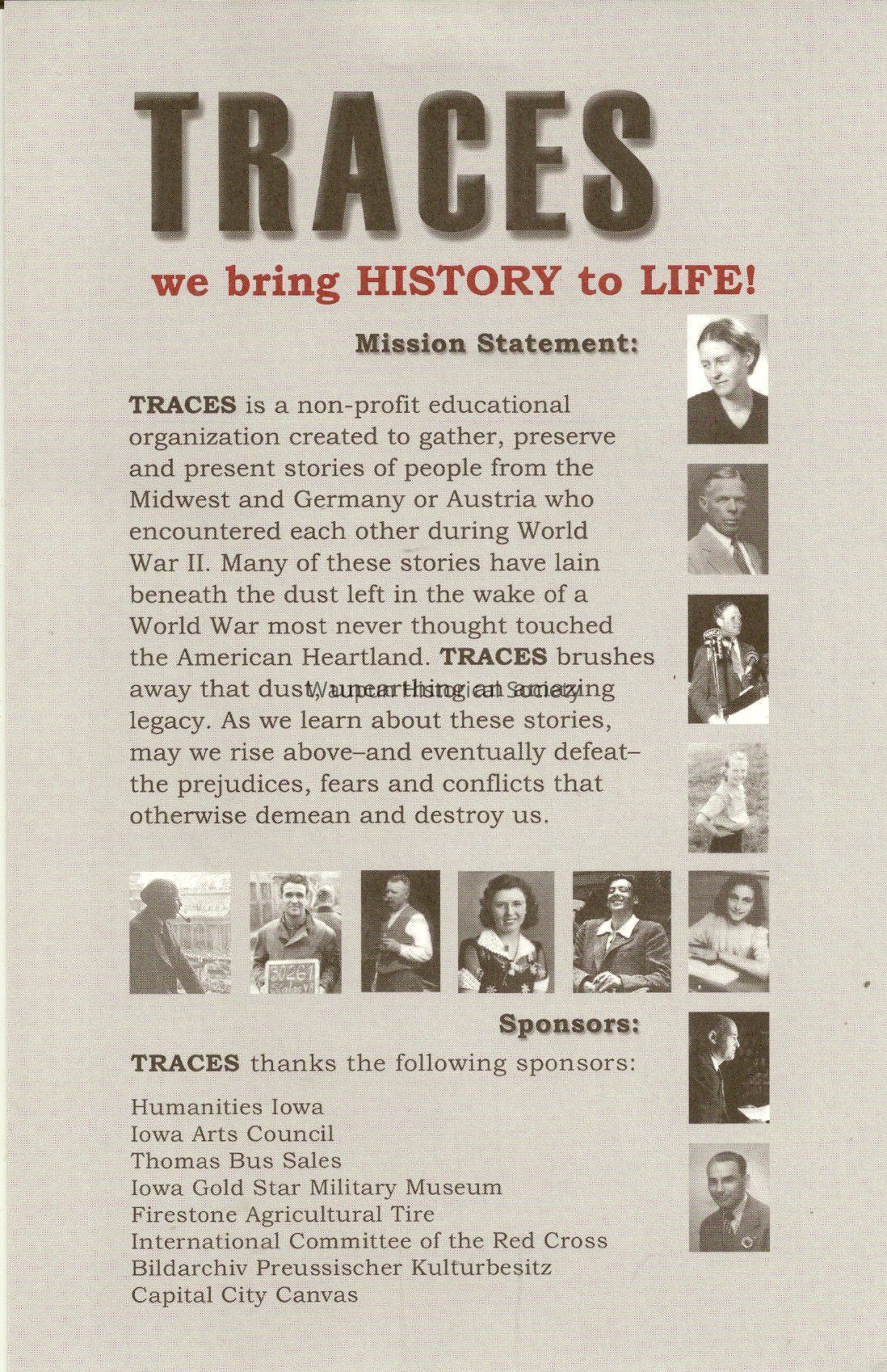 TRACES is a non-profit educational organization created to gather, preserve and present stories of people from the Midwest and Germany or Austria who encountered each other during World War II. Many of these stories have lain beneath the dust left in the wake of a World War most never thought touched the American Heartland. TRACES brushes away that dust, unearthing an amazing legacy. As we learn about these stories, may we rise above and eventually defeat the prejudices, fears and conflicts that otherwise demean and destroy us.