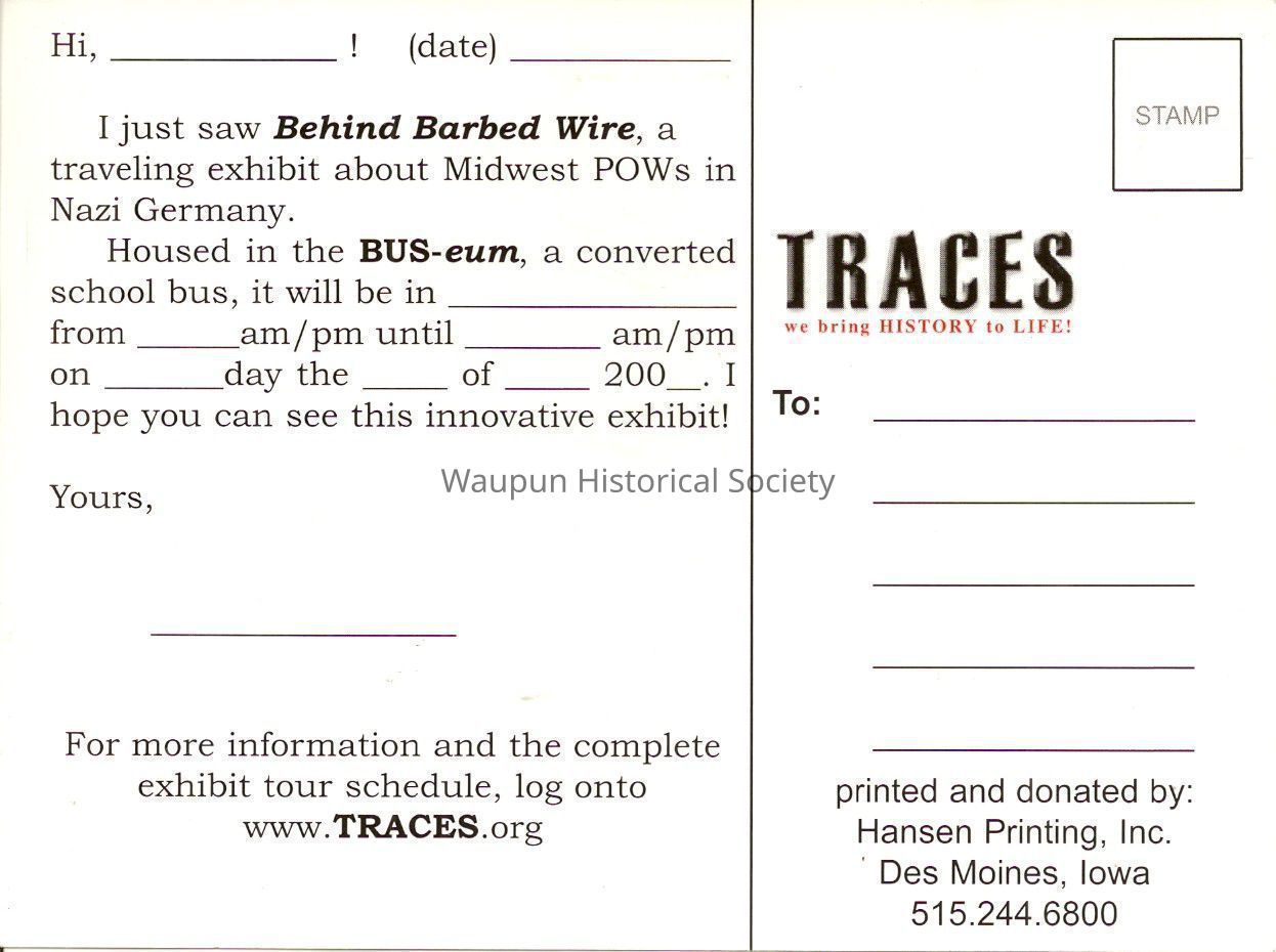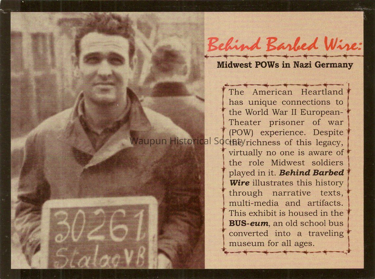 "Behind Barbed Wire" Midwest POW's in Nazi Germany, 2 sided postcard. The front of the postcard shows a prisoner and a brief explanation of what will be seen on the traveling BUSeum exhibit.